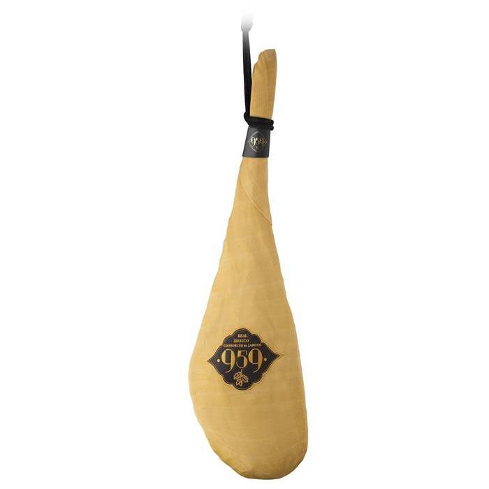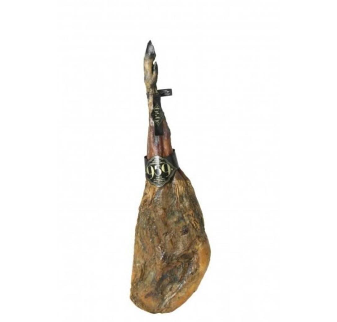 Se trata de un jamón de Bellota 100% ibérico entero con hueso, de peso de unos 6,250/6,750 Kg y de marca 959 de Consorcio de Jabugo. Tiene unos aromas profundos y muy persistentes, un sabor mágico debido al alto consumo de bellotas y pastos de las dehesas del cerdo ibérico durante la montanera (fase final del engorde al aire libre).