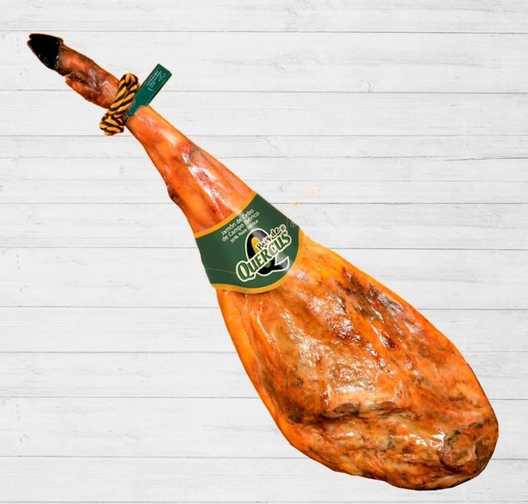 Jamón de cebo de campo 50% ibérico entero con hueso de 7/7,5 Kg de Jamones Quercus elaborado en el Bejar cerca de Guijuelo (Salamanca) : De menos intensidad que la calidad Bellota porque se trata de cerdos que comieron pastos y piensos en el campo, la calidad de este jamón de cebo de campo 50% ibérico sigue siendo una fantástica relación precio/placer.