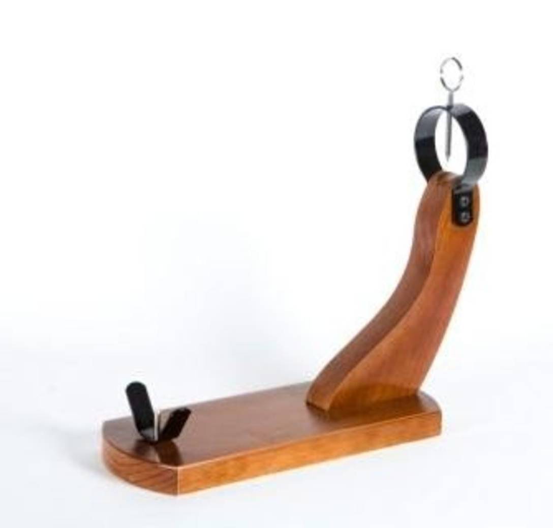 Es un jamonero elaborado con madera de pino de primera calidad. Los herrajes de hierro están pintados en negro epoxi y los pinchos de acero tienen el acabado de la superficie en cromo brillo.