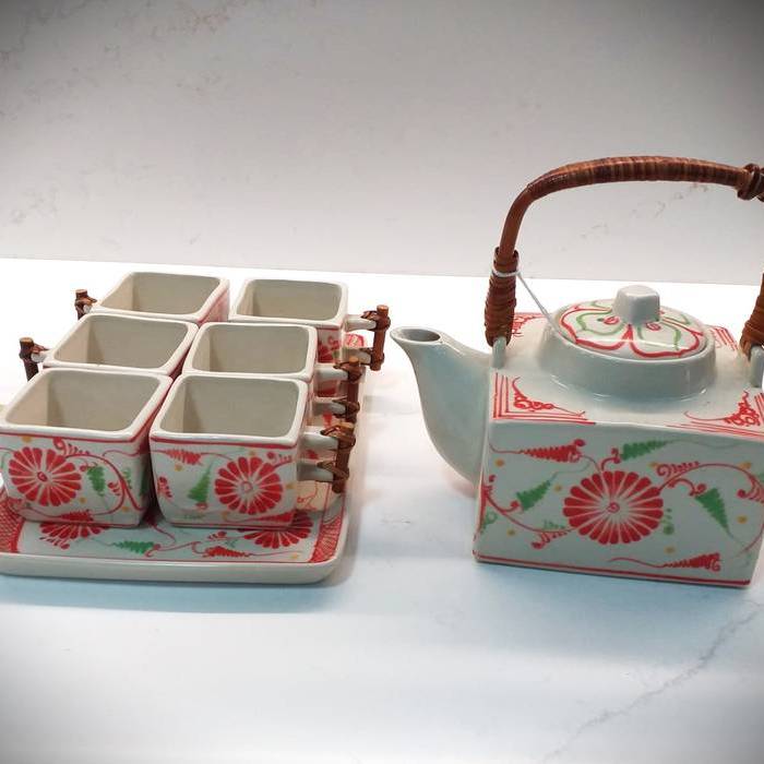 JUEGO DE TE DE , ESTILO JAPONES. CONSTA DE TETERA, 6 TAZAS Y UNA BANDEJA. TODO ELLO DE CERAMICA DECORADA CON LAS ASAS DE BAMBU