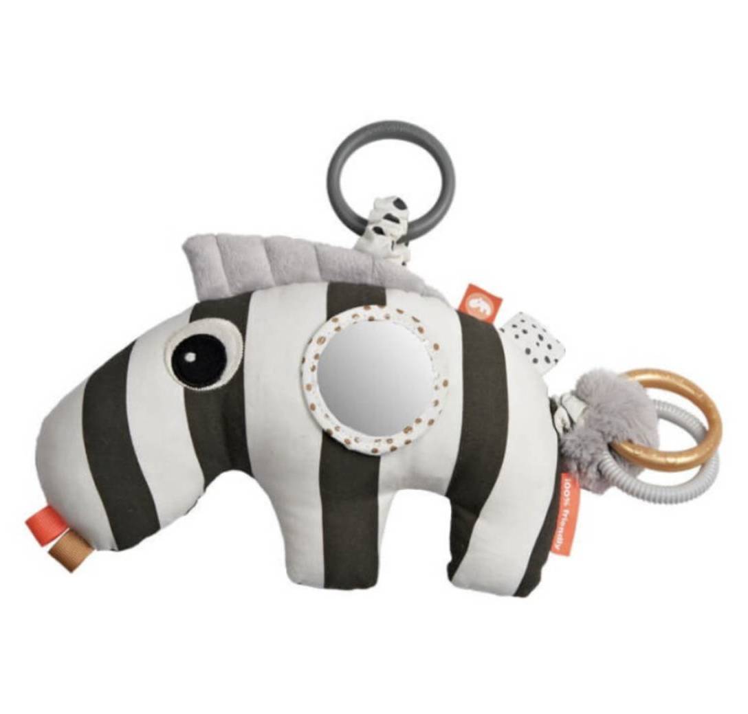 ¡Zebee es el juguete sensorial perfecto para tu bebé! Con rayas blancas y negras, texturas variadas, un espejo, y una melena crujiente, este juguete estimula todos los sentidos. Incluye anillos de mordedor que alivian las encías y producen sonidos. Con un enlace para sujetar al cochecito o asiento, siempre estará al alcance de tu pequeño. Materiales: 100% algodón, relleno de poliéster reciclado, mordedor de TPE, anillos de PP. Tamaño: 28 x 7 x 22 cm. Limpieza con paño húmedo.