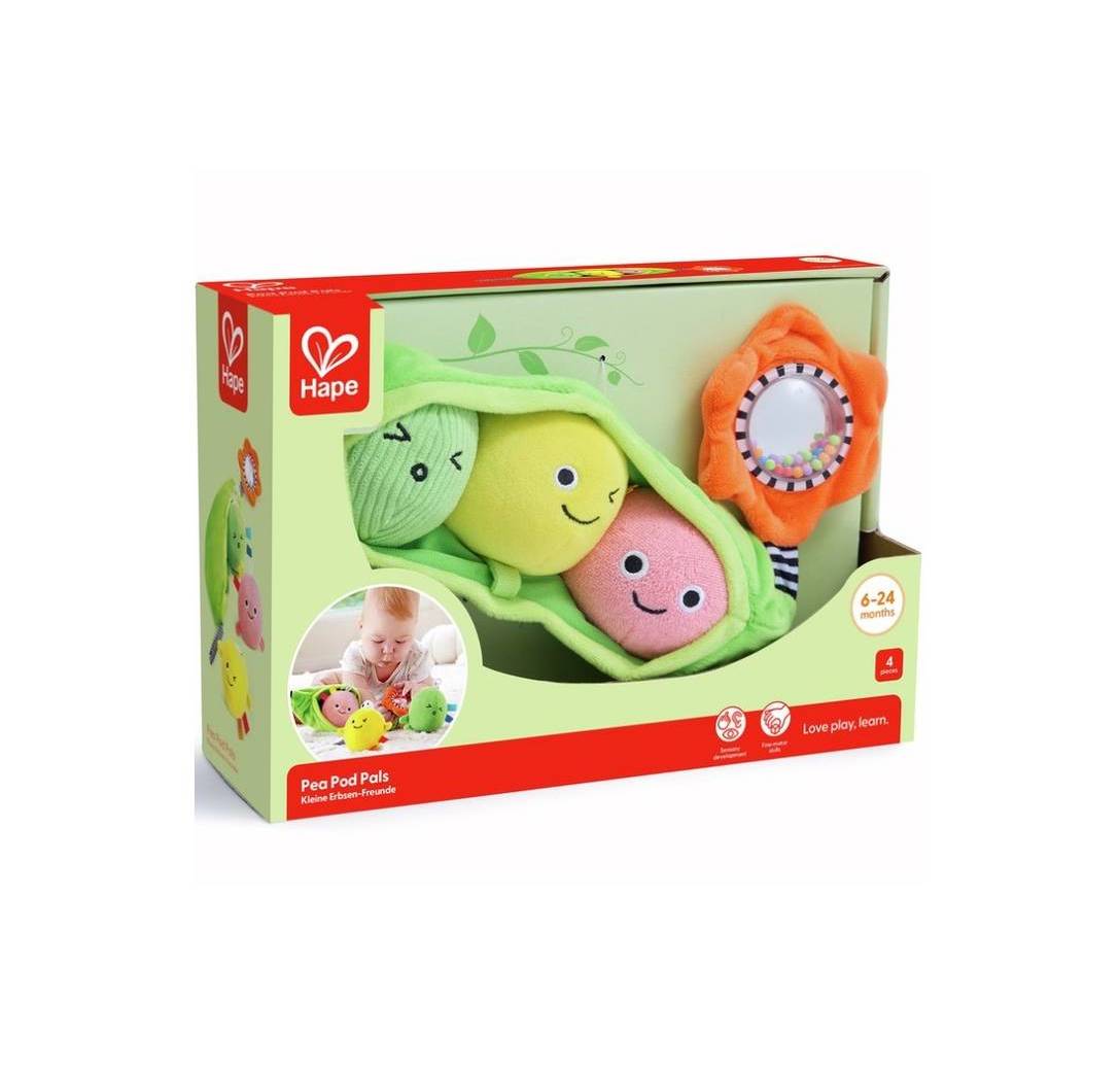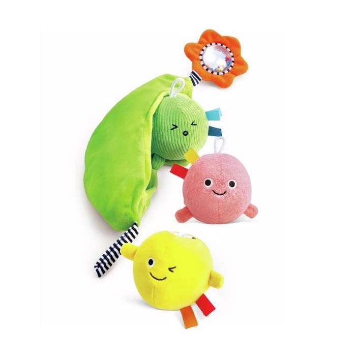 Los 3 guisantes se pueden guardar en la vaina de tela suave que hace de funda y tiene una flor sonajero en su extremo.