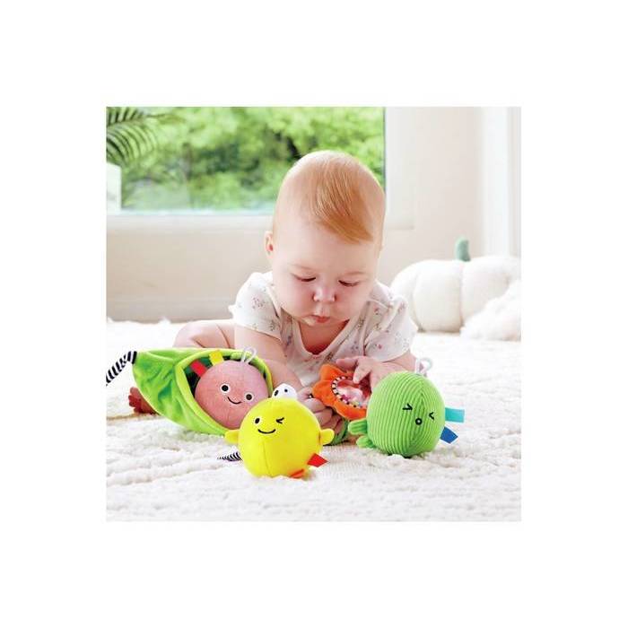Este set de tres guisantes de peluche está diseñado para estimular el agarre y desarrollar la motricidad fina y la coordinación mano-ojo. Sus colores y diseño atraen la atención de los bebés, promoviendo el seguimiento visual y las habilidades de reconocimiento de colores.