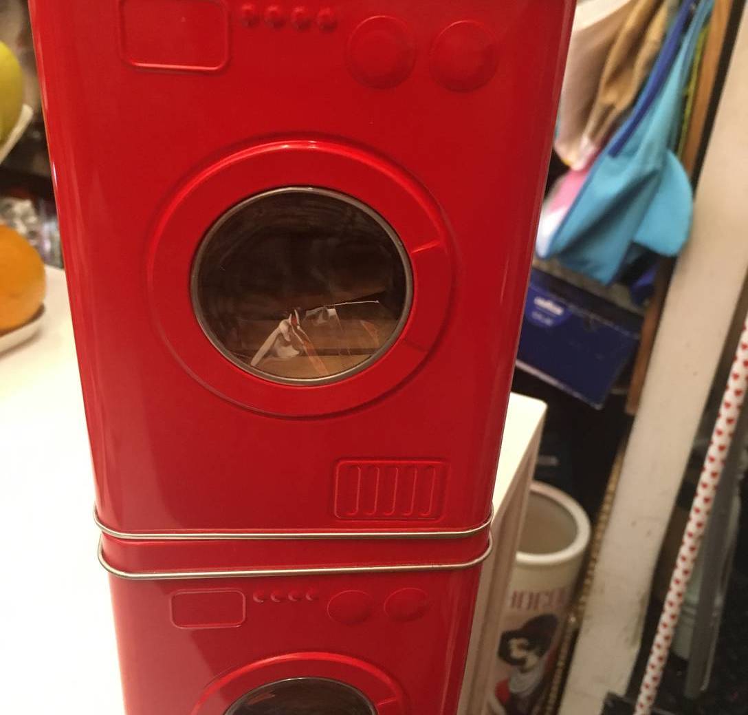 Preciosa lata roja imitación de una lavadora y viene con pinzas de madera en su interior.