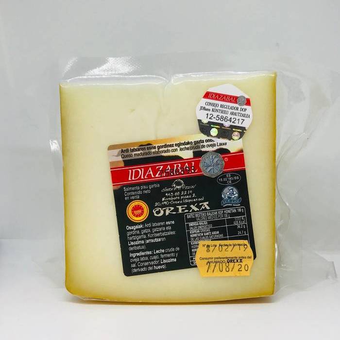 Queso Idiazabal ahumado con Denominación de Origen entero de 1,3/1,4 Kg : Elaborado con leche cruda de oveja latxa en los caseríos de los pastores vascos, este queso hace parte de la flor de la producción de Idiazabal. De sabor intenso y a veces fuerte según la curación.