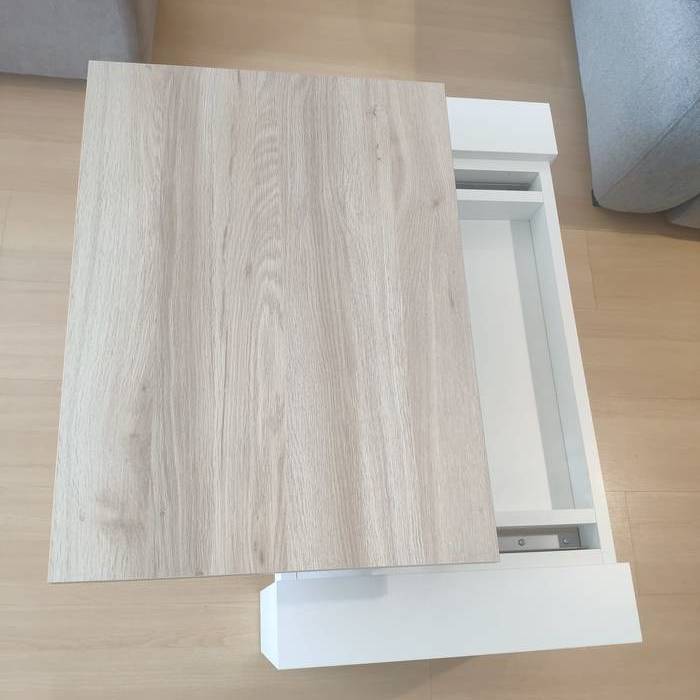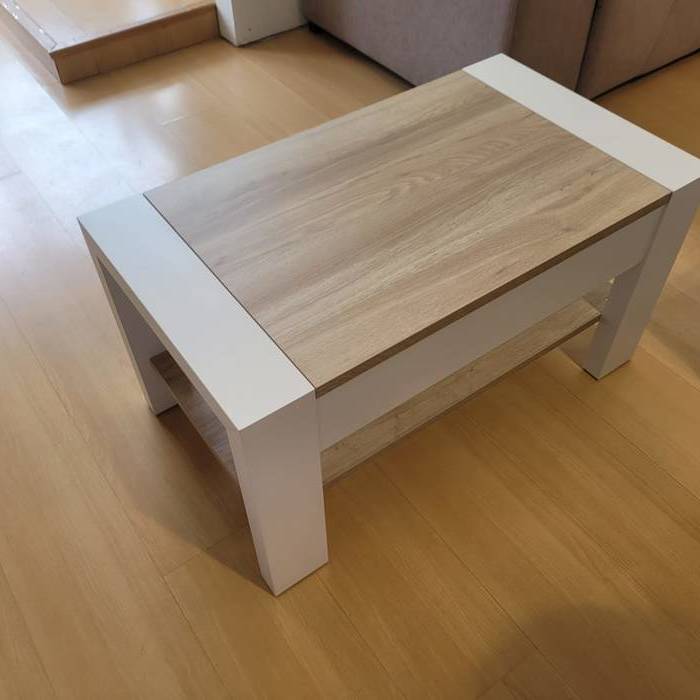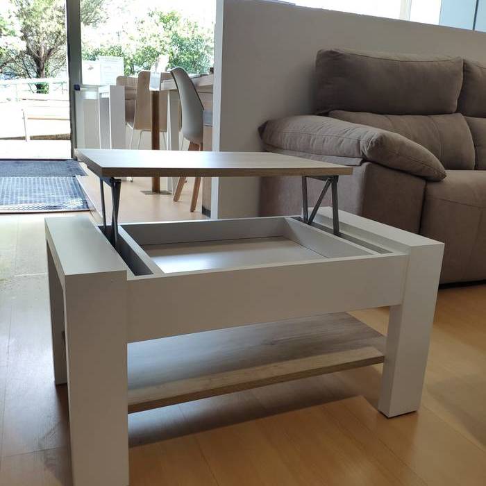 Mesa de centro elevable en tonos de madera clara y tono blanco, de estilo nórdico y actual. La mesa mide 80X45