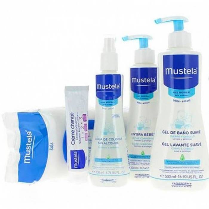 Preciosa y práctica bolsa de paseo con 5 productos para la higiene y el cuidado de la piel del recien naciso. La bolsa contiene: