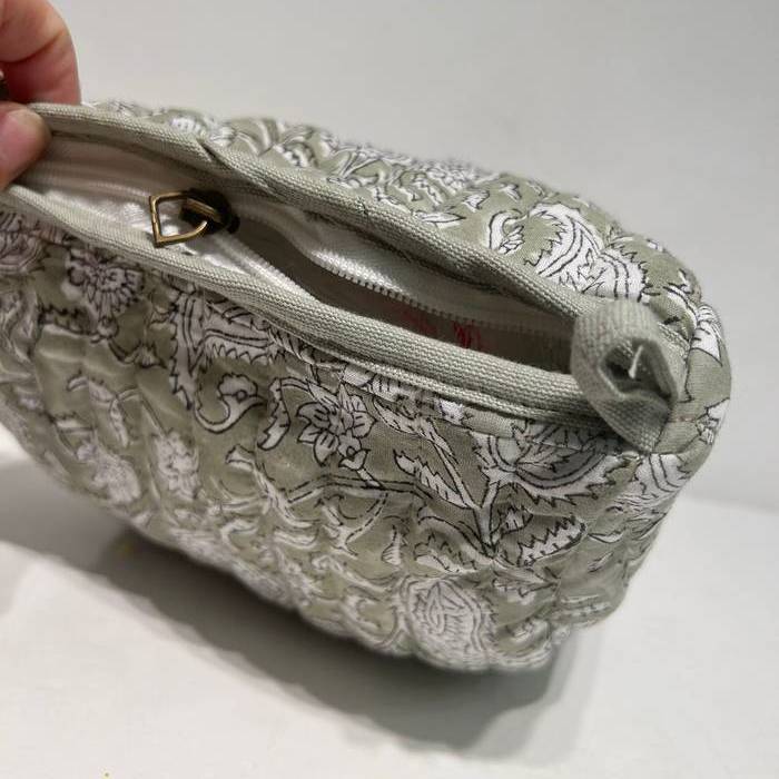 Neceser de algodón acolchado en colores alegres, con bonito estampado de fondo verde claro con flores blancas y grises. Cierre con cremallera. Gracias a su tejido natural es fácil de lavar. En el podrás guardar tus cremas de playa o tus productos de viaje.