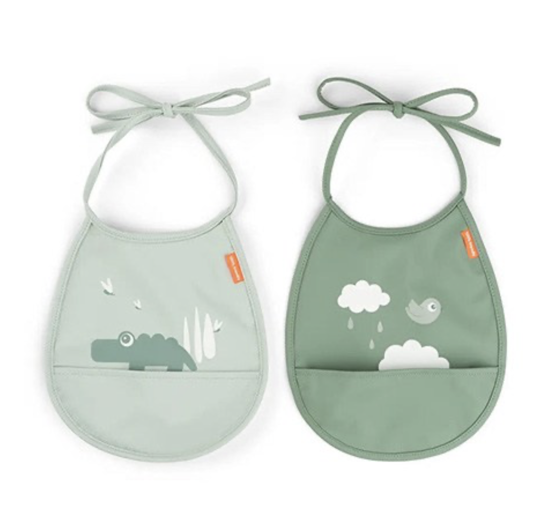 Este práctico paquete de 2 baberos en frescos tonos verdes presenta divertidos motivos de Croco y Birdee, haciendo que la hora de la comida sea más divertida y menos desordenada. Con una superficie impermeable, estos baberos brindan una excelente protección para la ropa de su hijo y se pueden limpiar fácilmente después de las comidas.