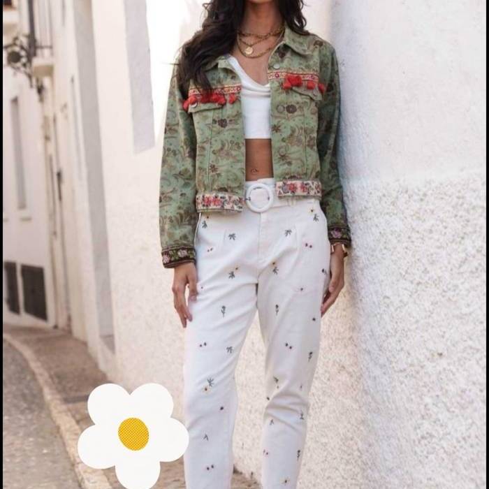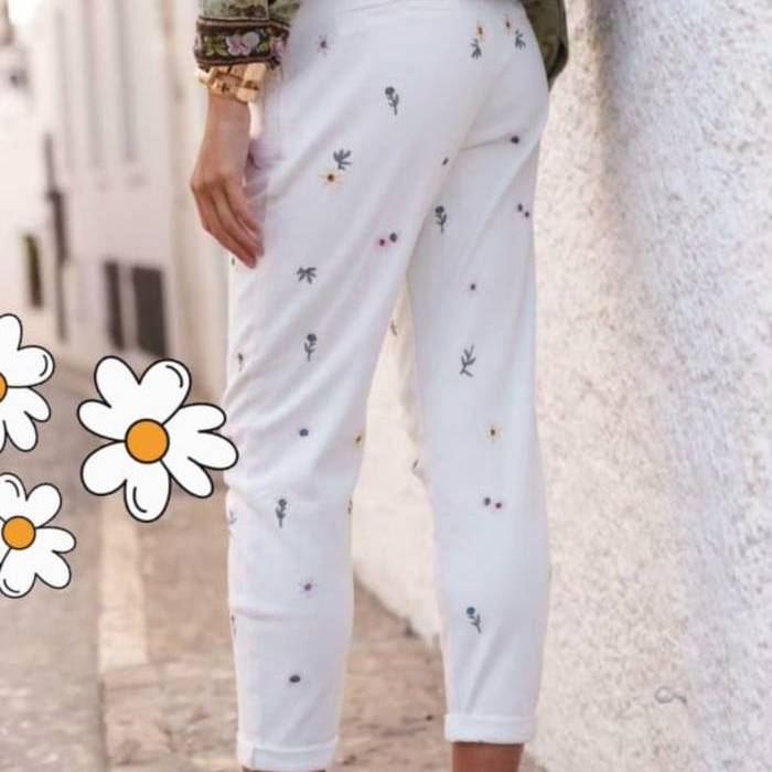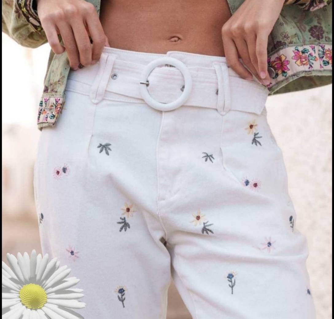 Pantalón de vestir en algodón fondo blanco con detalles de margaritas de colores bordadas . Cinturón de tela al tono . Tiro medio alto . Ideal para arrancar la primavera .