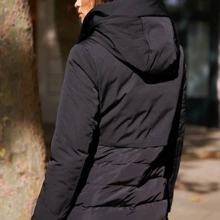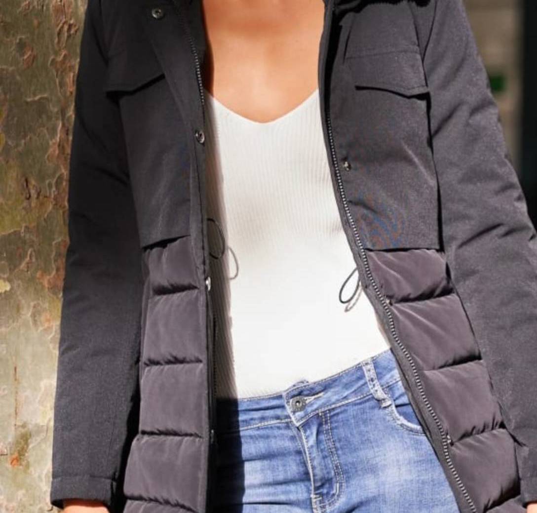 Parka con firma ligeramente evade . Capucha fija . Combina la linea lisa con el plumifero .