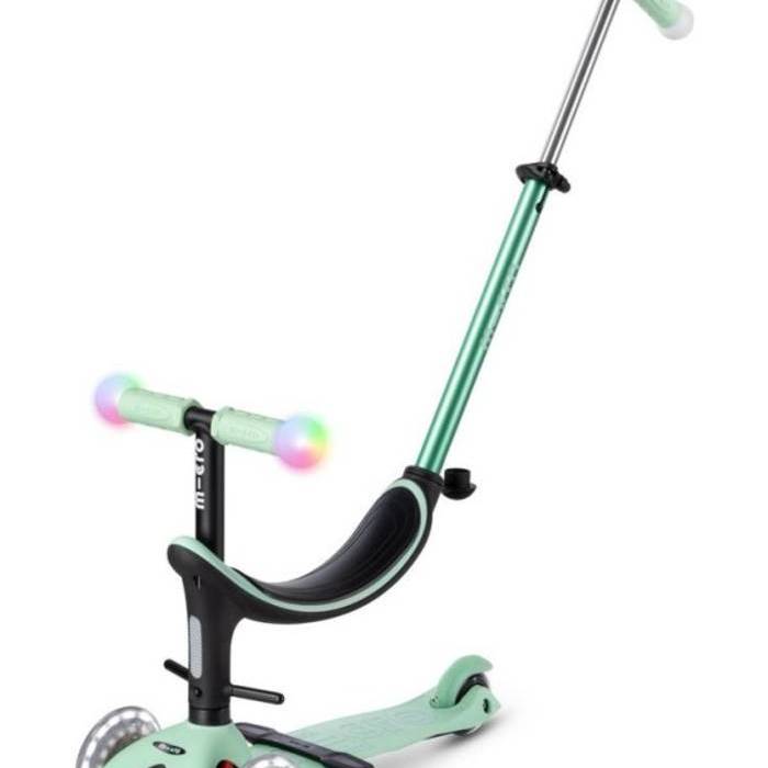 Gracias a su multifuncionalidad, puede utilizarse a partir de los 12 meses y acompañará a su hijo como mínimo hasta los seis años. Este innovador y ergonómico patinete todo en uno puede utilizarse en diferentes variantes: al principio con asiento, dos opciones de reposapiés y barra de empuje para los padres, más adelante sin barra de empuje, como una mezcla entre bicicleta de equilibrio y patinete y, por último, como un Mini Micro Deluxe clásico con bombillas LED mágicas en el manillar y ruedas lunares LED. La barra de empuje para los padres puede utilizarse en posición vertical, además de la posición horizontal estándar. Esto significa que sólo se necesita una mano para empujar, protegiendo así la muñeca y los músculos. Además, el Micro Mini2Grow Deluxe Magic LED convence con un manillar ajustable en altura, un mecanismo patentado de inclinación hacia delante y un reposapiés con agarre adicional.