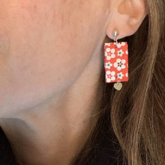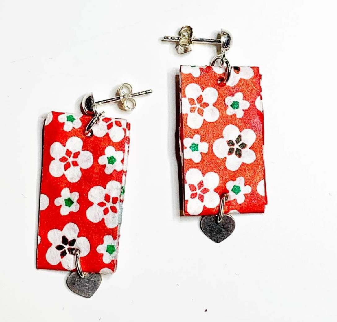 Pendientes en papel japones, color rojo montado sobre base de plata.