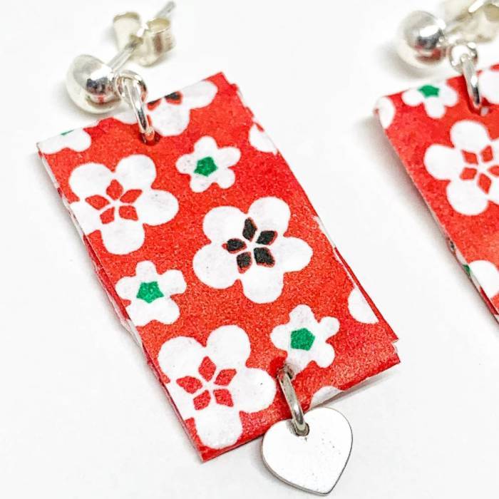 Pendientes hechos a mano, en plata con elemento de papel washi, papel japonés, de color rojo.
