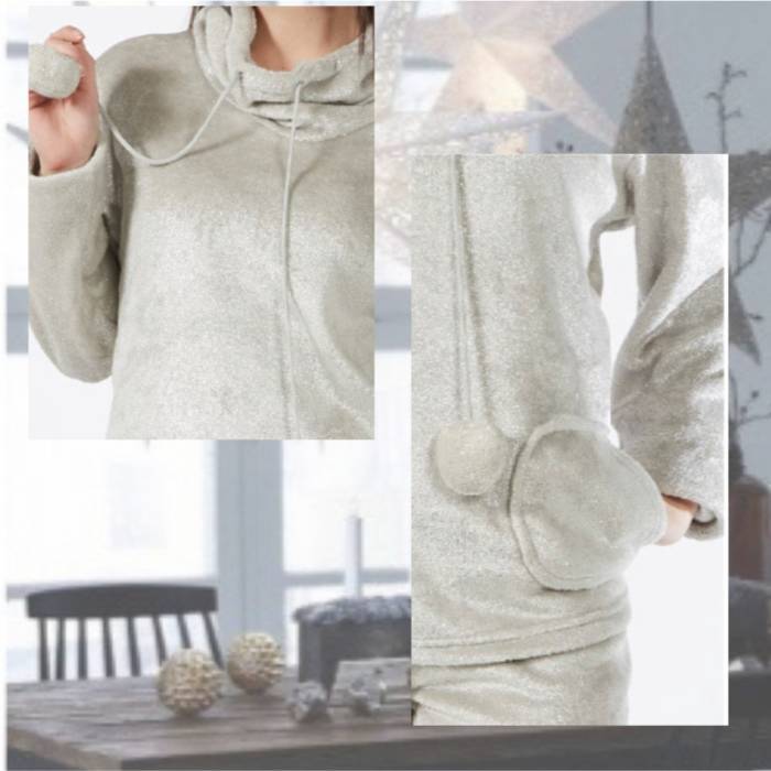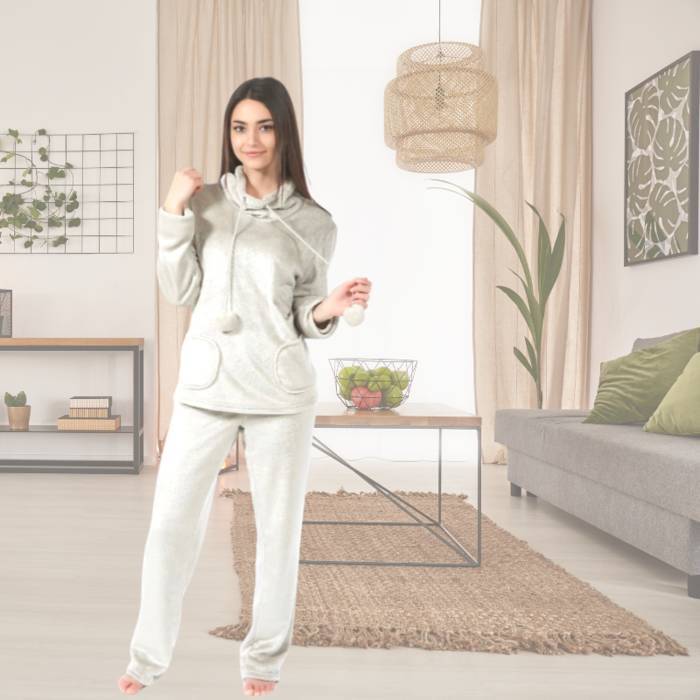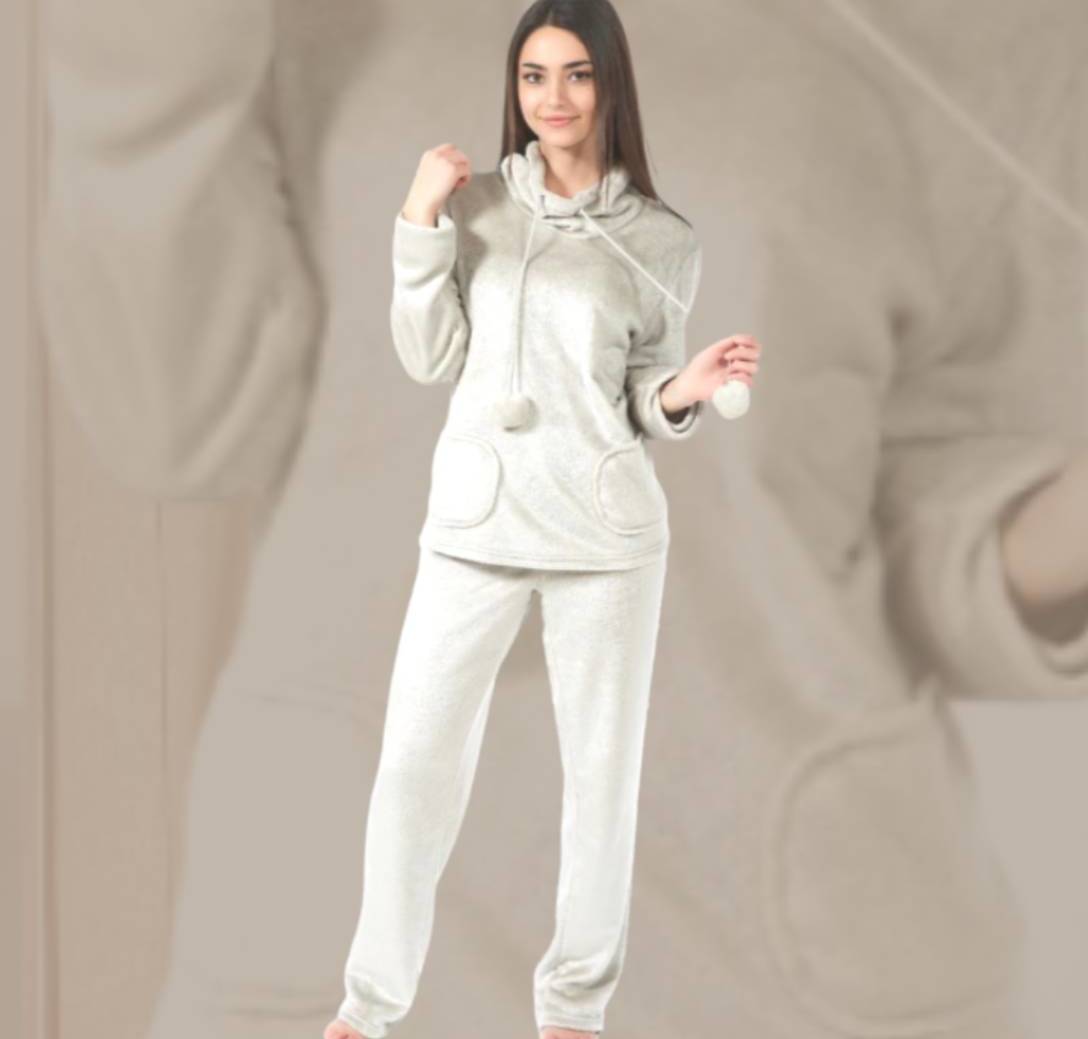 Precioso pijama para chica, por su diseño es ideal como ropa para estar en casa, ropa cómoda que te costará quitarte cuando salgas a la calle. El tejido tiene un ligero brillo muy favorecedor. La parte de arriba tipo sudadera lleva cuello caído con bonita cinta que termina en ponpon y bolsillos delanteros. Perfecto para ti y para regalar.