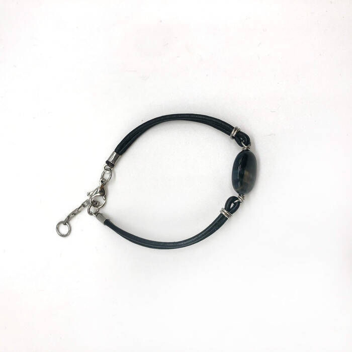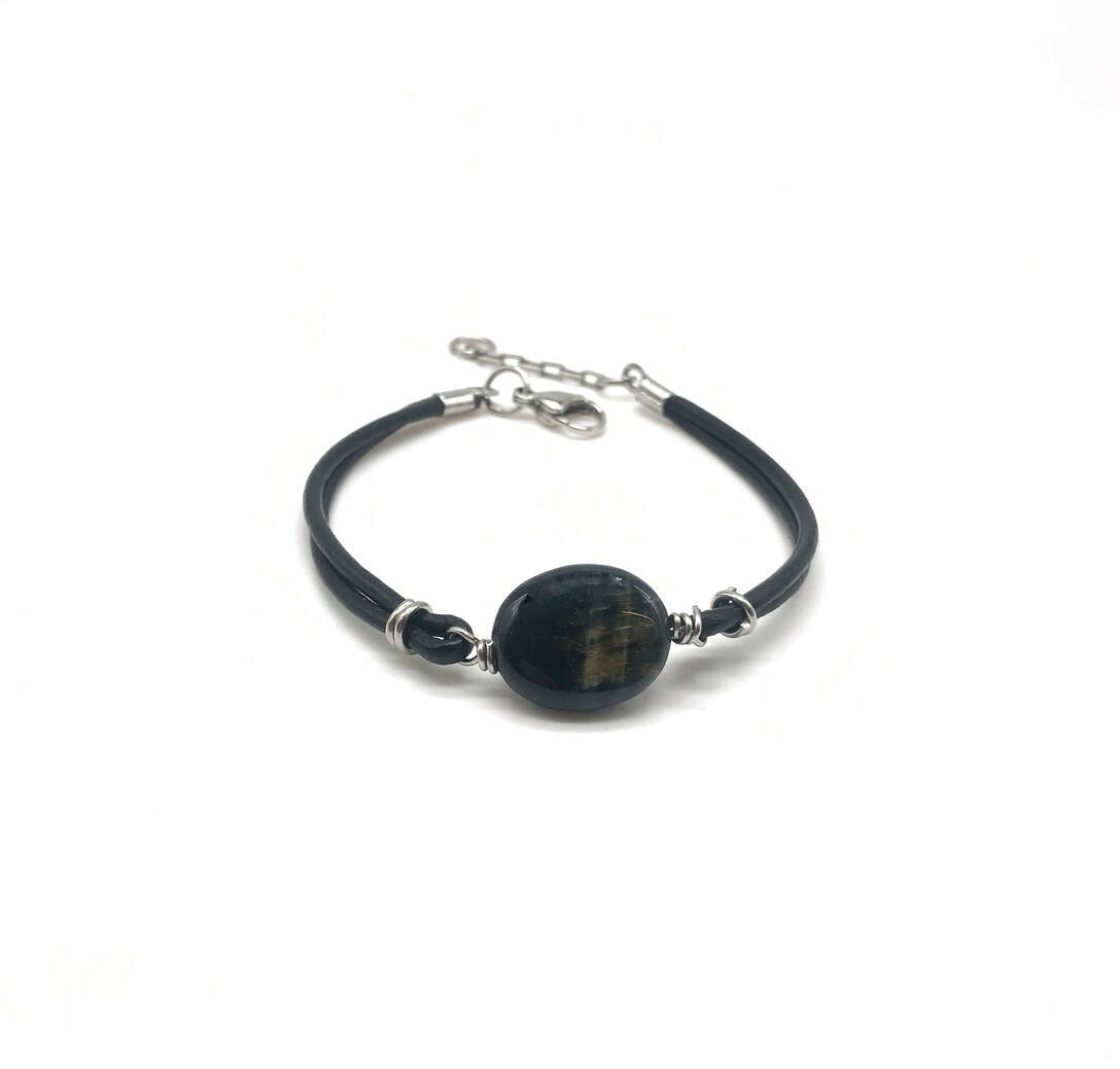 Esta pulsera se compone de una pieza oval de ojo de halcón, cordón de cuero negro y componentes y cadena de extensión de acero.