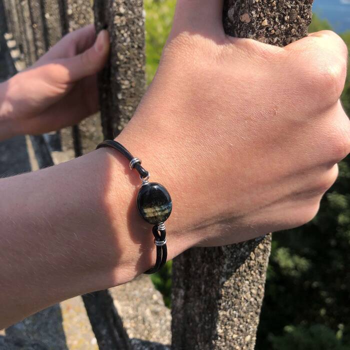 Una pulsera de estilo minimalista que es un placer ver y tocar. La piedra, que pertenece a la familia del cuarzo, se llama ojo de halcón. Sus capas reflejan la luz y dan su característico brillo sedoso.