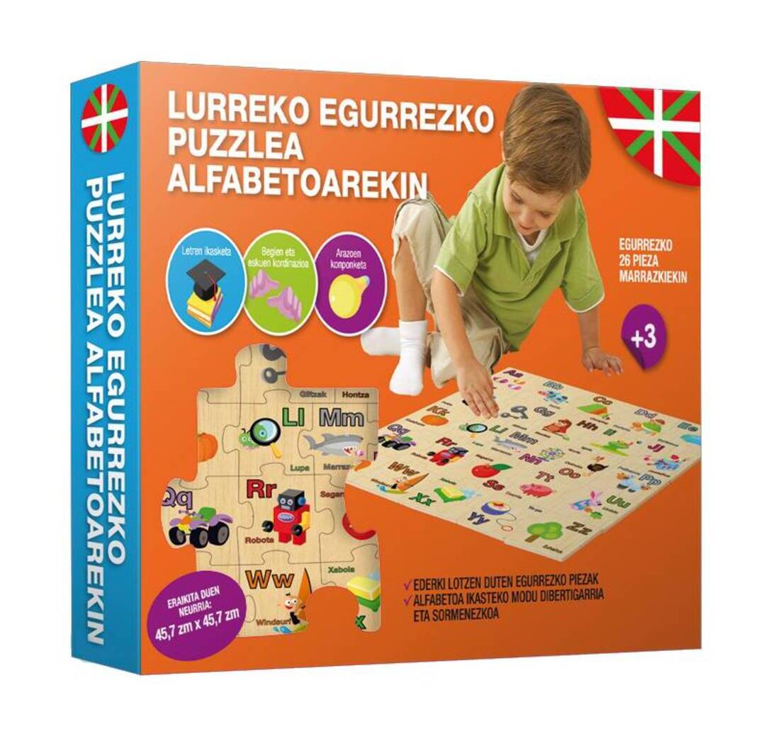 El puzzle de madera ABC para suelo contiene 26 piezas, una por cada letra del alfabeto. Cada pieza contiene la letra y la imagen de una palabra que empieza por su letra. Las piezas de madera encajan perfectamente, y una vez completado alcanza las medidas de 45,7×45,7cm.