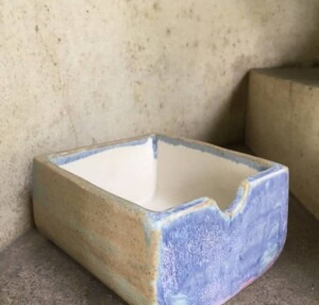 Recipiente azul piedra y blanco mate realizado en gres. Apto para lavavajillas y microondas