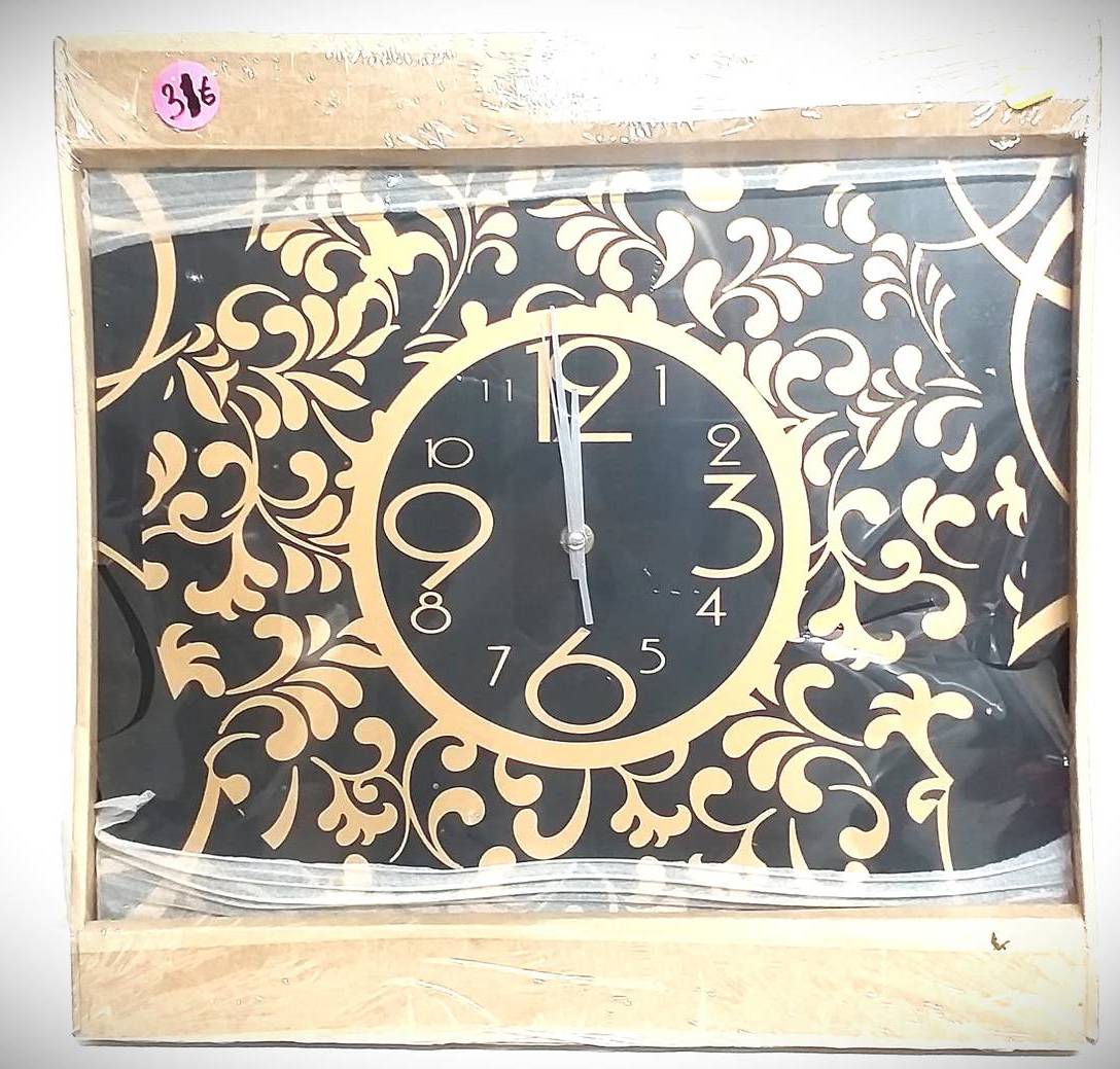 RELOJ DE PARED CUADRADO 40 cm X 40cm COLOR NEGRO CON MOTIVOS DORADOS