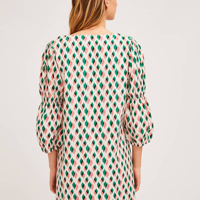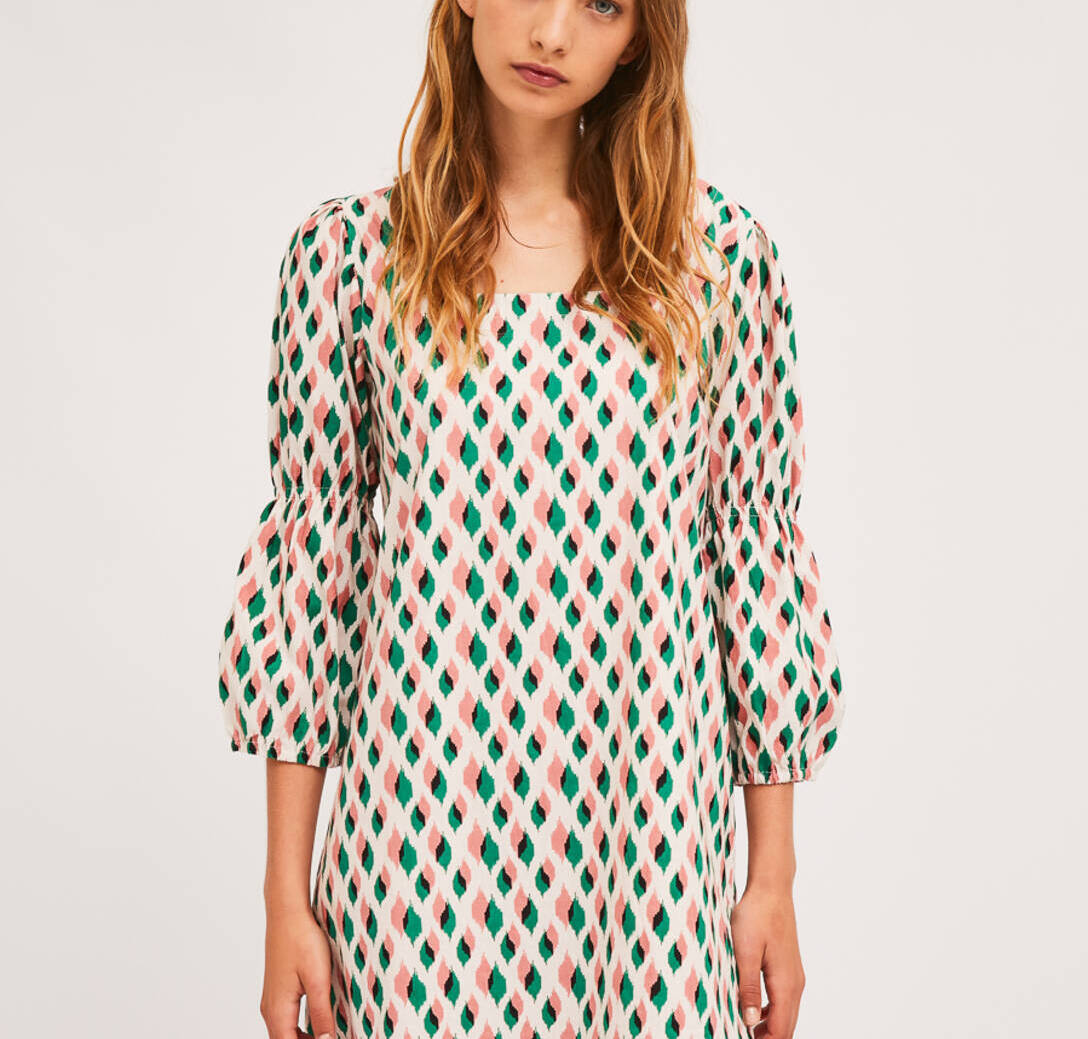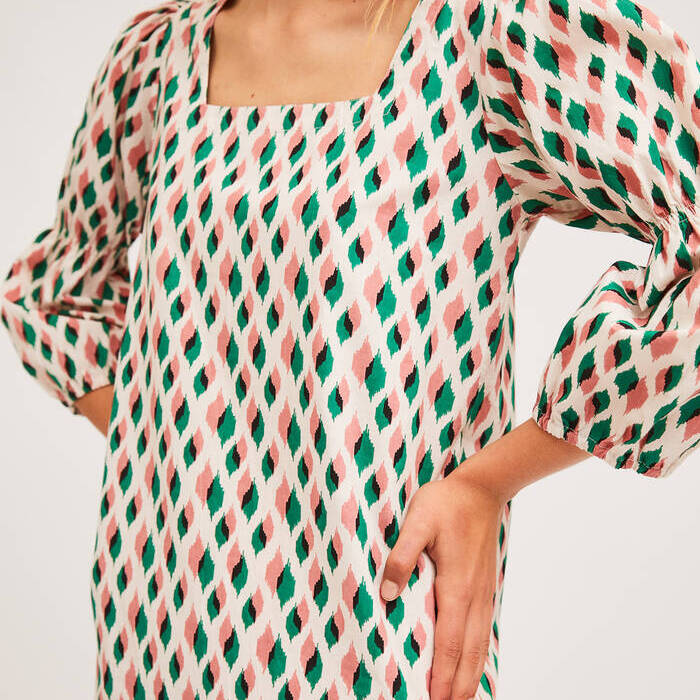 Vestido evasé de color blanco con estampado geométrico de corbatas en verdes y rosas.