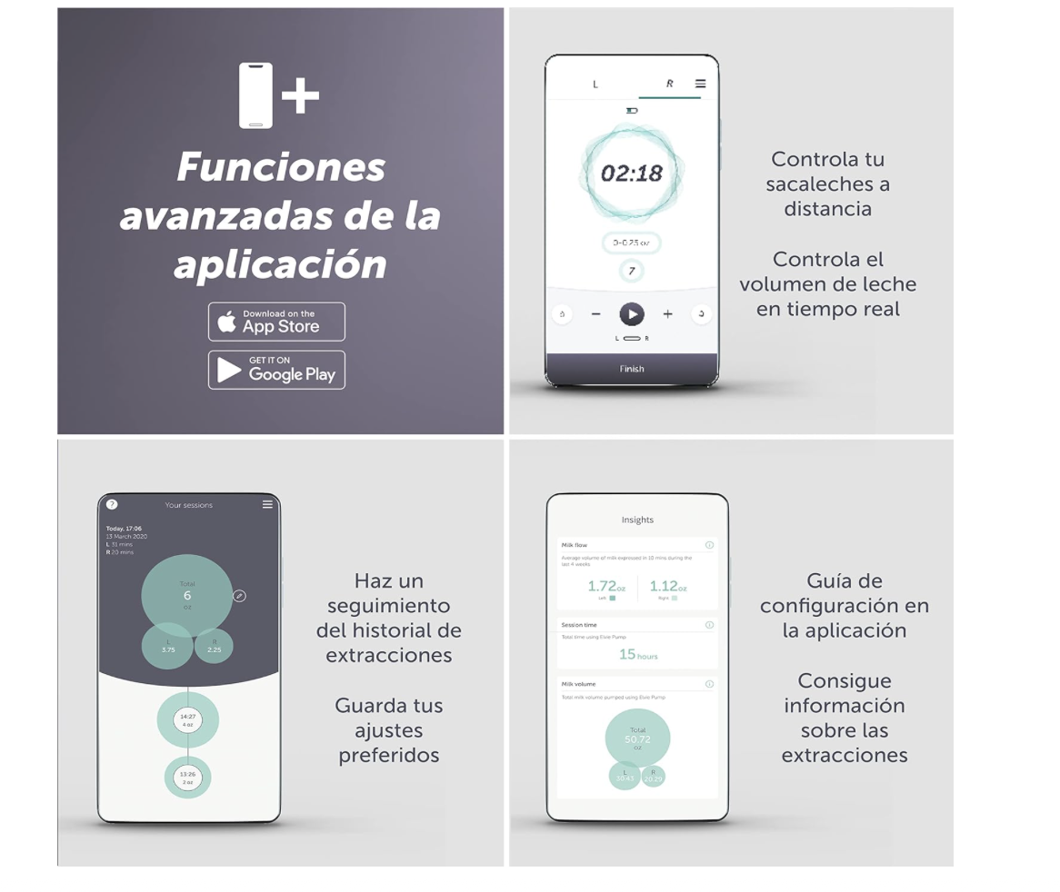 Conéctate a la aplicación gratuita Elvie Pump para supervisar el volumen de leche en tiempo real, realizar un seguimiento del historial de extracción de cada pecho y controlar la extracción de forma remota. Aplicación disponible en Español.