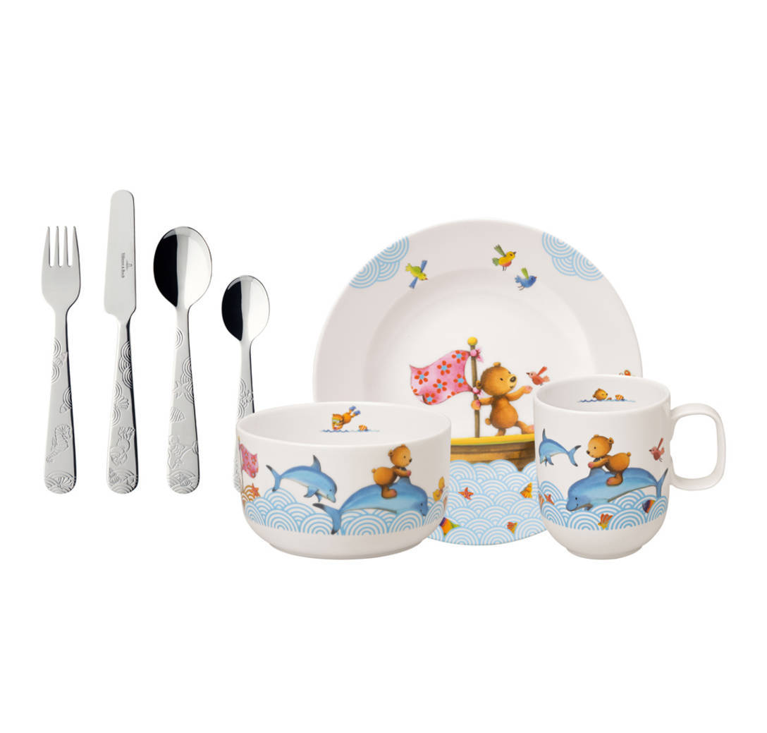 Juego de tres piezas de vajilla infantil de porcelana con cubiertos, apto para lavavajillas y microondas