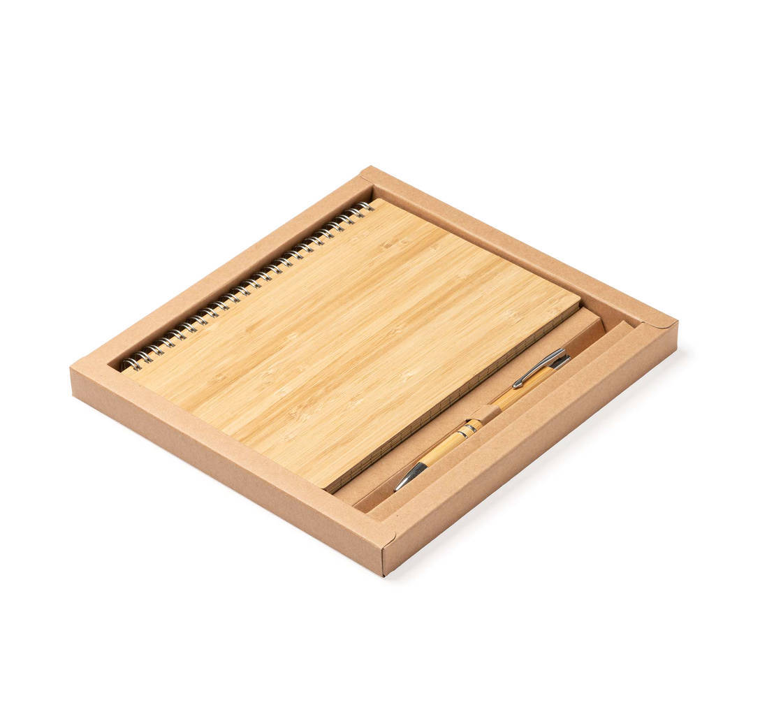 Set de escritorio personalizado compuesto por libreta y bolígrafo en línea nature. Incluye libreta de anillas con tapas rígidas en bambú, con 80 hojas de disposición a una raya y diseño eco. Bolígrafo de mecanismo pulsador, con cuerpo en bambú y accesorios metálicos. Cartucho jumbo y tinta negra. Presentado en estuche de cartón troquelado y diseño eco.