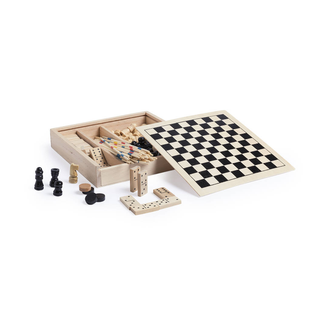 Set de juegos de mesa en madera. Incluye mikado, ajedrez, damas y dominó. Presentado en estuche de madera con tapa-tablero. Tablero con lado liso para marcaje.