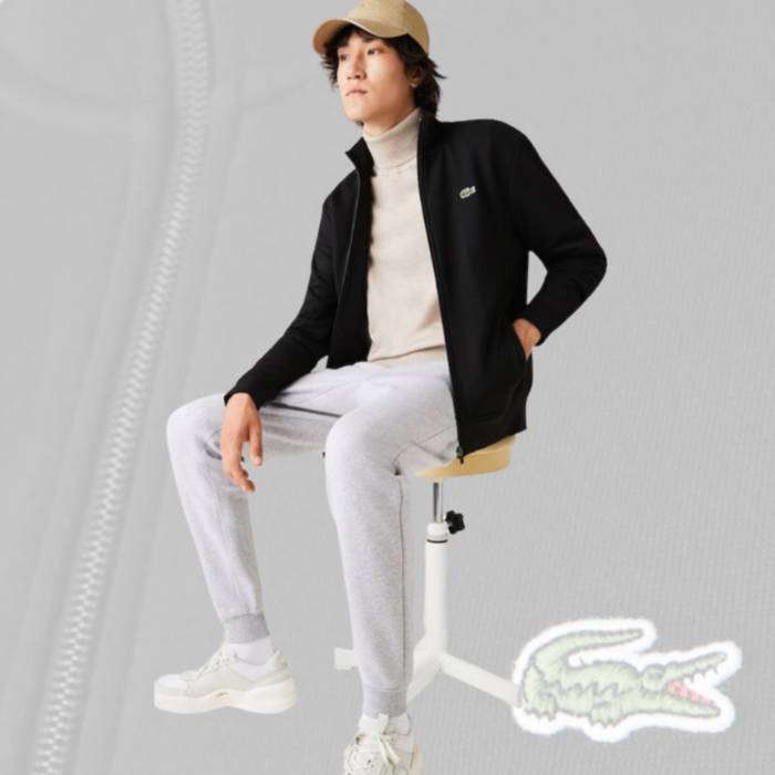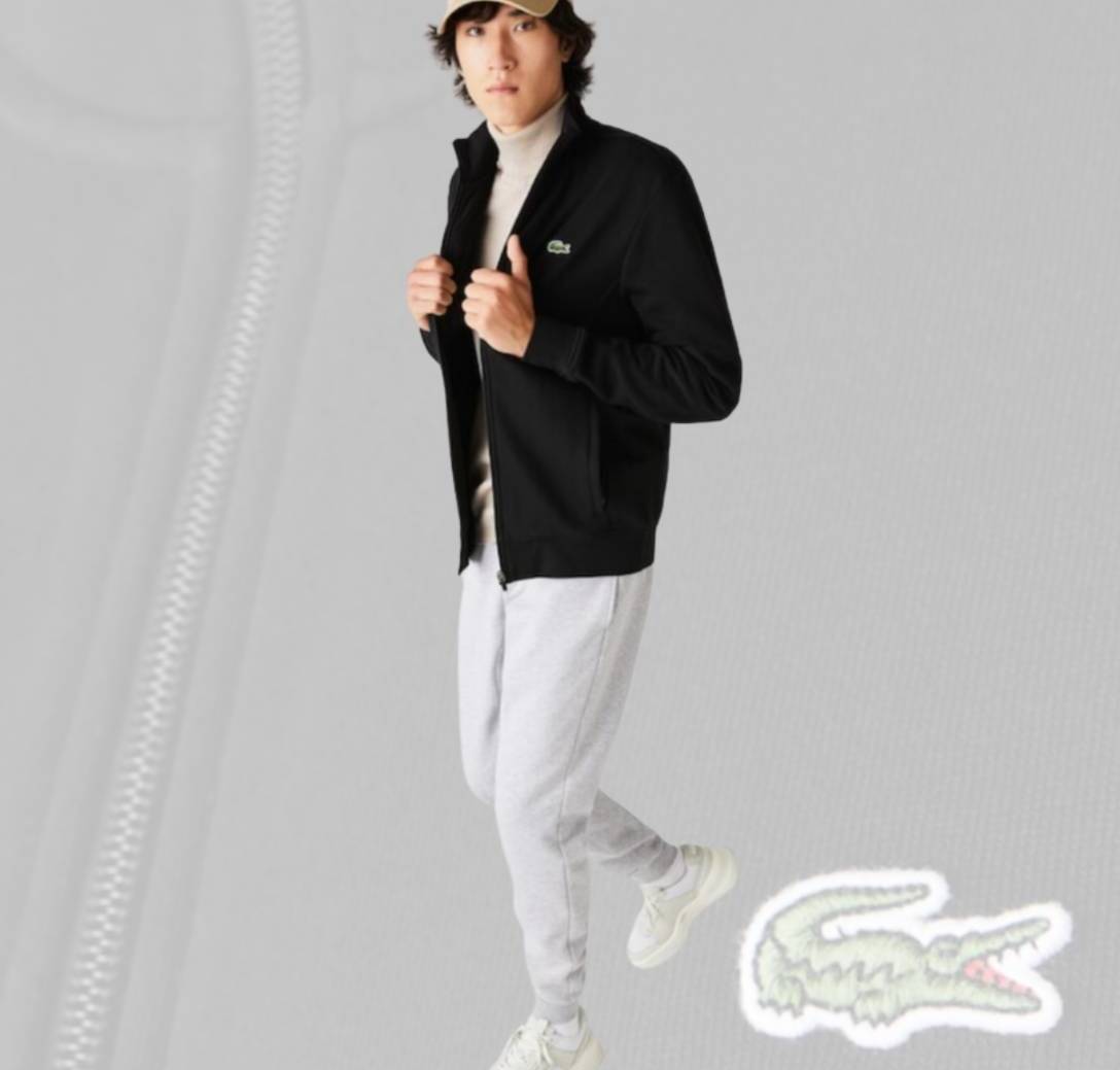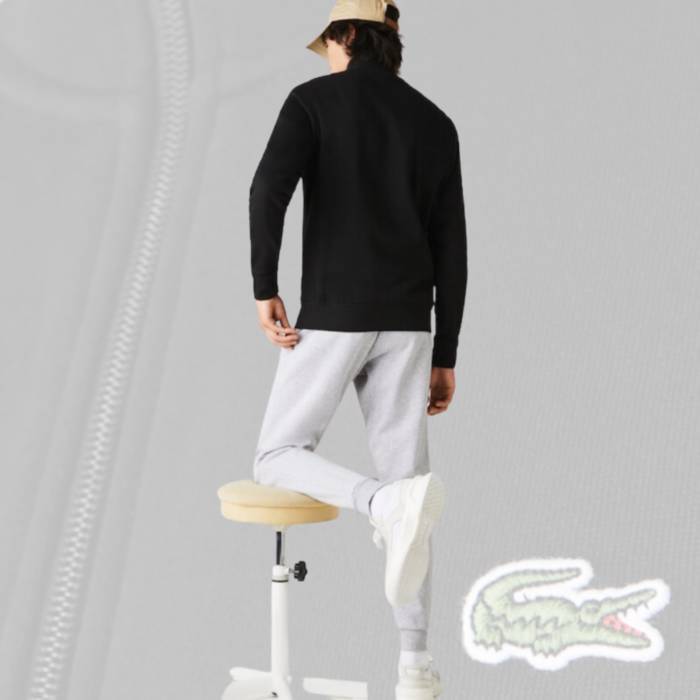 Esta nueva sudadera lisa Lacoste con cremallera, una prenda deportiva básica, está confeccionada en felpa de algodón. Presenta un cuello alto y una media luna de tafetán diamantado. Una versión funcional de la sudadera clásica.