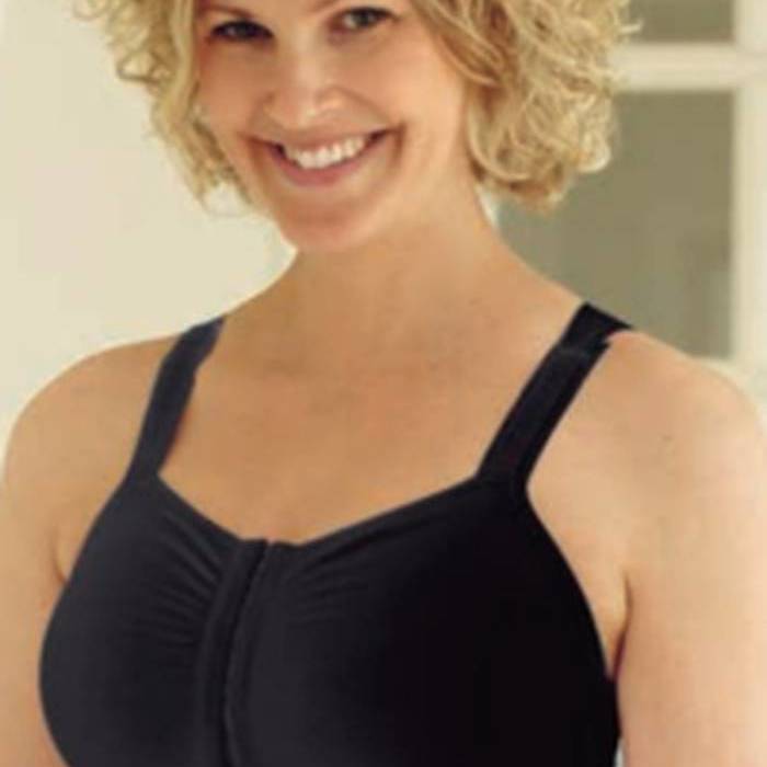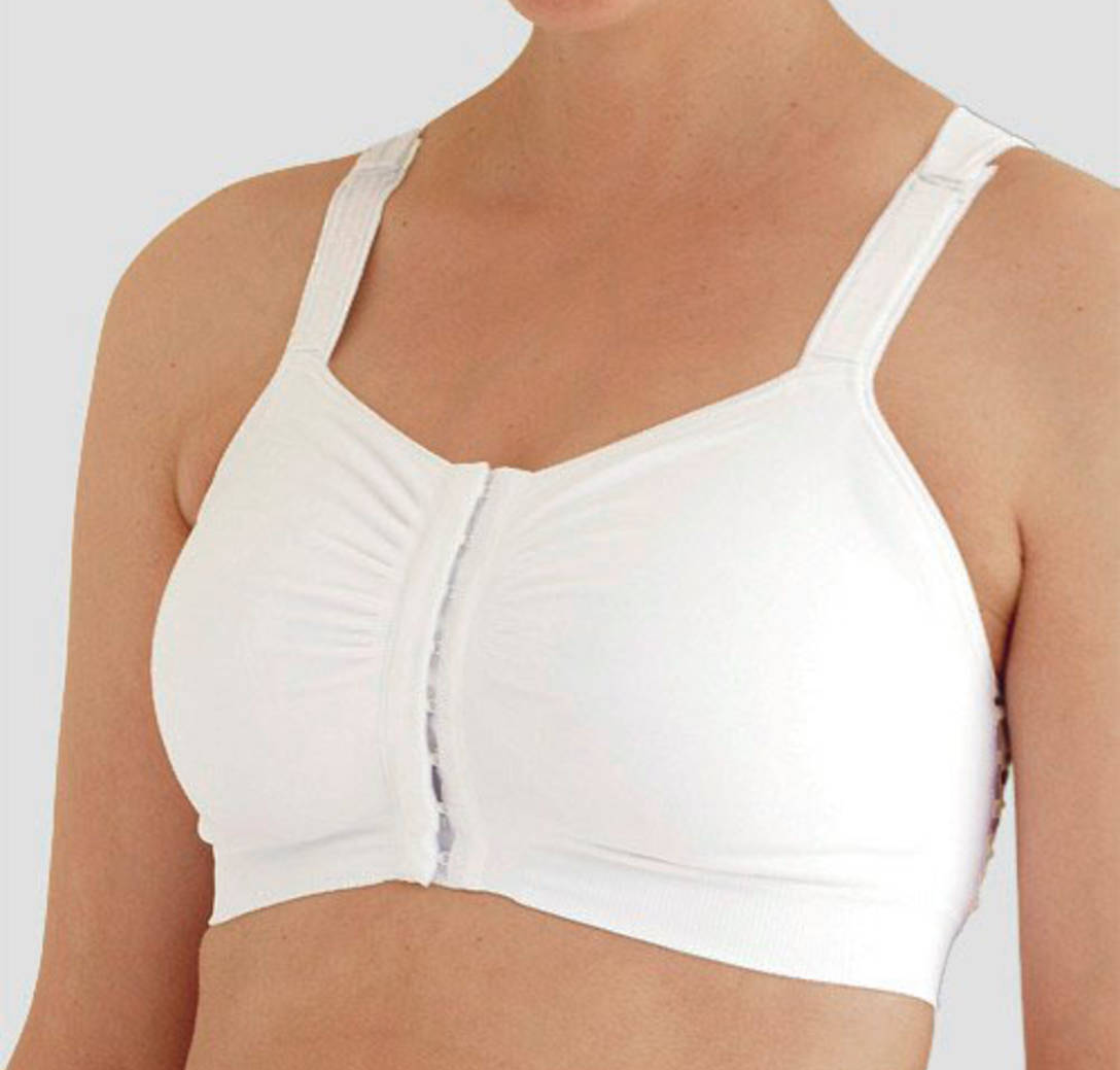 Sujetador de microfibra suave y transpirable, proporciona apoyo y alivio tras una cirugía mamaria. Fácil de poner y cierre delantero para mayor comodidad con dos niveles de ajuste. Tirantes anchos y regulables y bolsillos para prótesis de mama. 91% Poliamida 9% Elastan Disponible en blanco y negro. (Disponemos de prótesis de mama, convenio con Osakidetza)