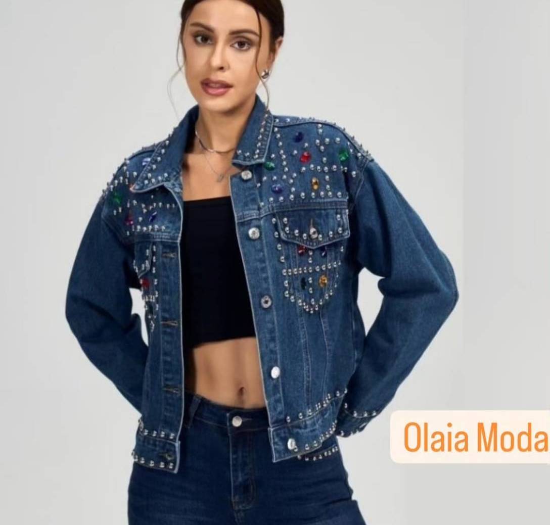 Cazadora vaquera a la cadera , corte amplio con pedrería de colores. Comoda y sofisticada .
