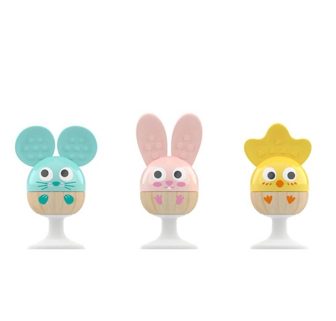 Estos adorables sonajeros están diseñados para estimular los sentidos del bebé y aliviar la dentición. Con orejas de silicona de grado alimenticio sin BPA, son seguros para morder. Emiten sonidos únicos al moverse, despertando la curiosidad del bebé. Su cuerpo de madera de haya tiene un acabado seguro y resistente. Además, cuentan con ventosas en la base, permitiendo fijarlos a superficies lisas para mayor diversión. Tamaño ideal para sus manitas. A partir de 0 meses.