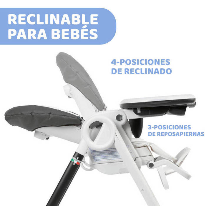 RECLINABLE: Respaldo reclinable para primeros meses y relax tras las comidas. Reposapiernas y reposapiés regulables para adaptarse al crecimiento del bebé.