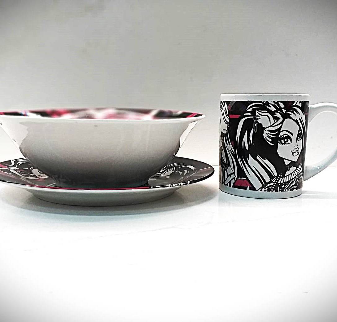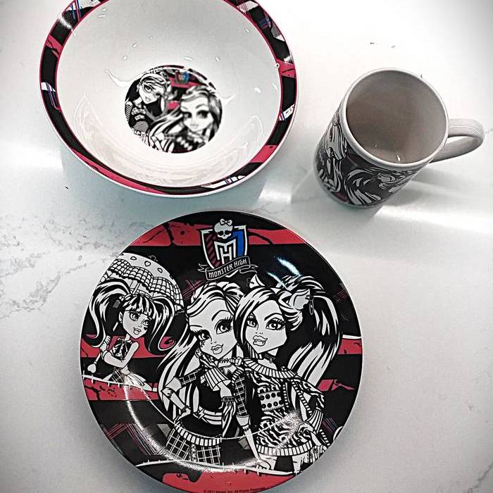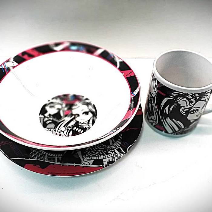 SET DE DESAYUNO DE LAS FAMOSAS MONSTER HIGH ESTE SET, CONSTA DE UN PLATO LLANO, UN CUENCO Y UNA TAZA