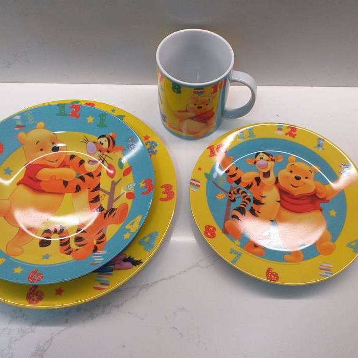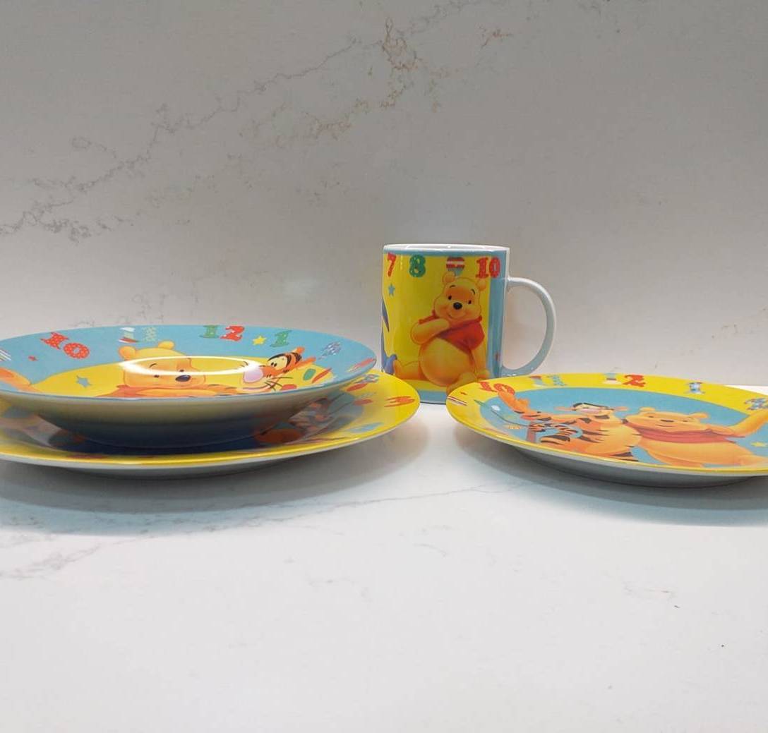 VAJILLA DE PORCELANA DE WINNIE THE POOH. ESTA VAJILLA CONSTA DE 1 TAZA, 1 PLATO HONDO Y 2 PLATOS LLANOS