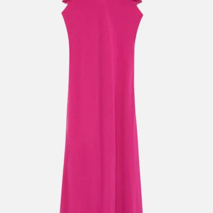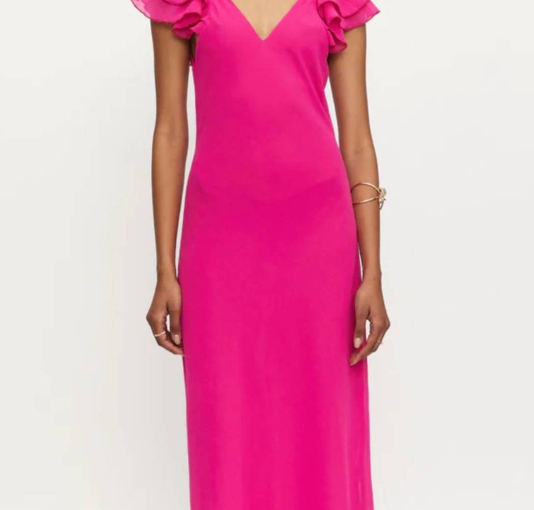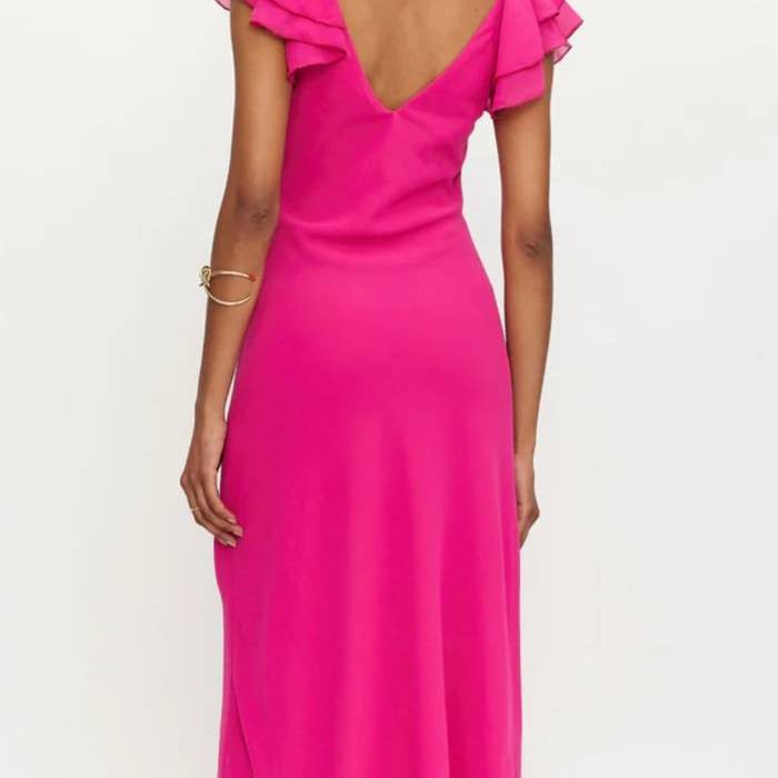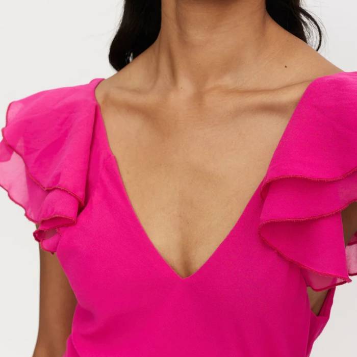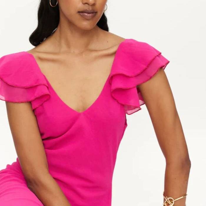 Vestido largo en tejido chifon rosa . Doble escote pico delantero y trasero , manga corta con volantes . Entallado , ideal para cualquier evento veraniego .