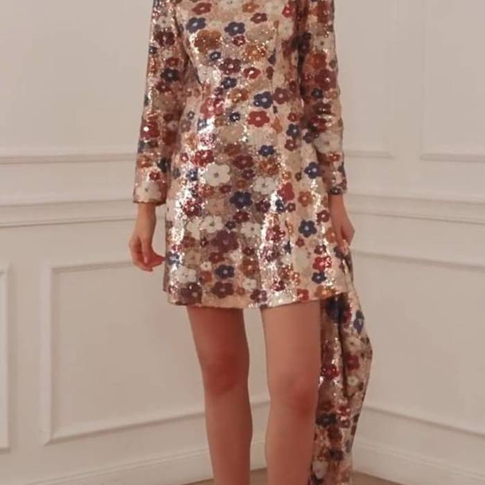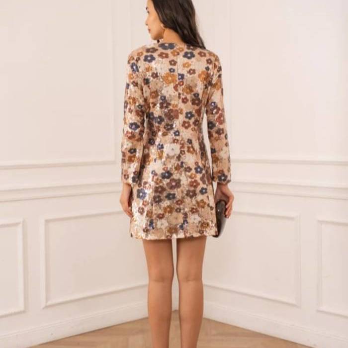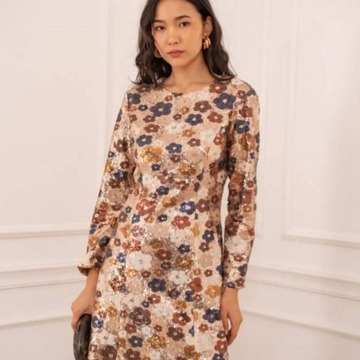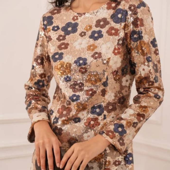 Vestido ideal para ir cómoda y elegante a cualquier evento. Fondo beige con flores marrones, azules y crudas . Semi entallado con cremallera trasera .