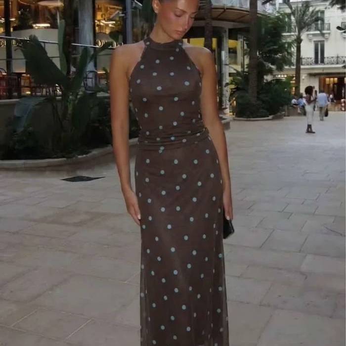 Vestido de motas en color marrón largo mido y sin mangas . Ajustado al cuerpo en tejido elástico .