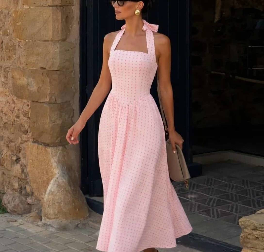 Vestido inspirado en los años 60 , cuerpo entallado falda vuelo y anudado al cuello . Algodón .Totalmente femenino.