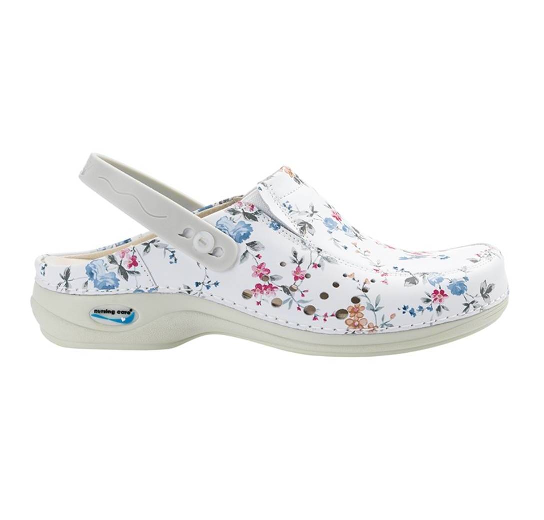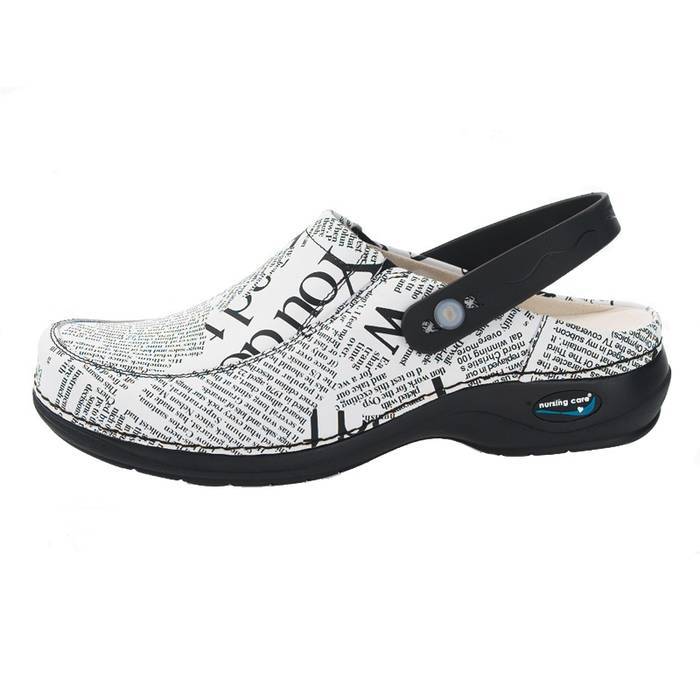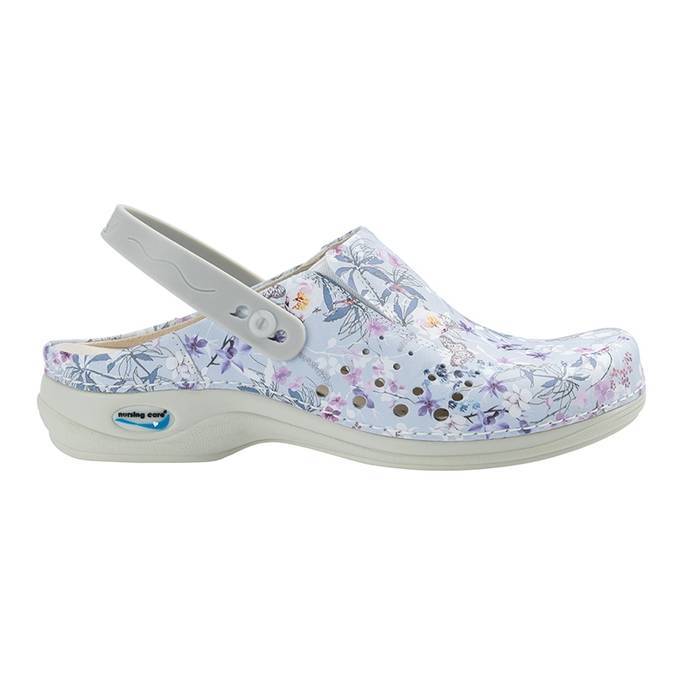 Zueco lavable en lavadora en frío. Con plantilla extraible y suela antiestática y antideslizante. LLeva tira de sujección en el talón.