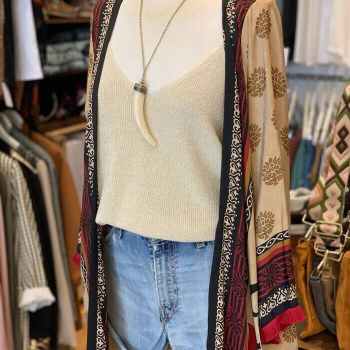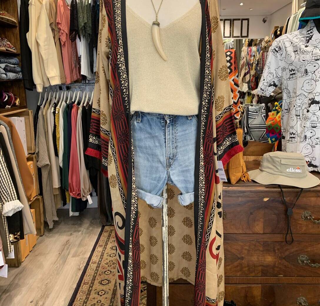 Look Coachella, Levisen short vintage batez osatua, tirantezko kamiseta urre kolorekoa eta zetazko kimonoa % 100 natuarala, mahuketan fleko laburrekin errematatua. Gustatzen zaizu? Zoaz dendara eta probatu. Ezin zaizu falta uda honetan.