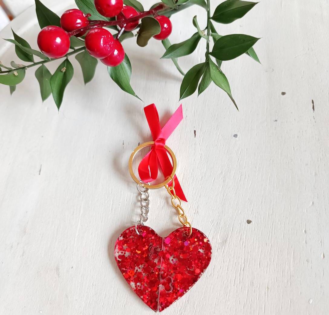 Materiala: bihotza erretxina gardenean, kolore dibertigarriko brillantinarekin, altzairu herdoilgaitzezko metala