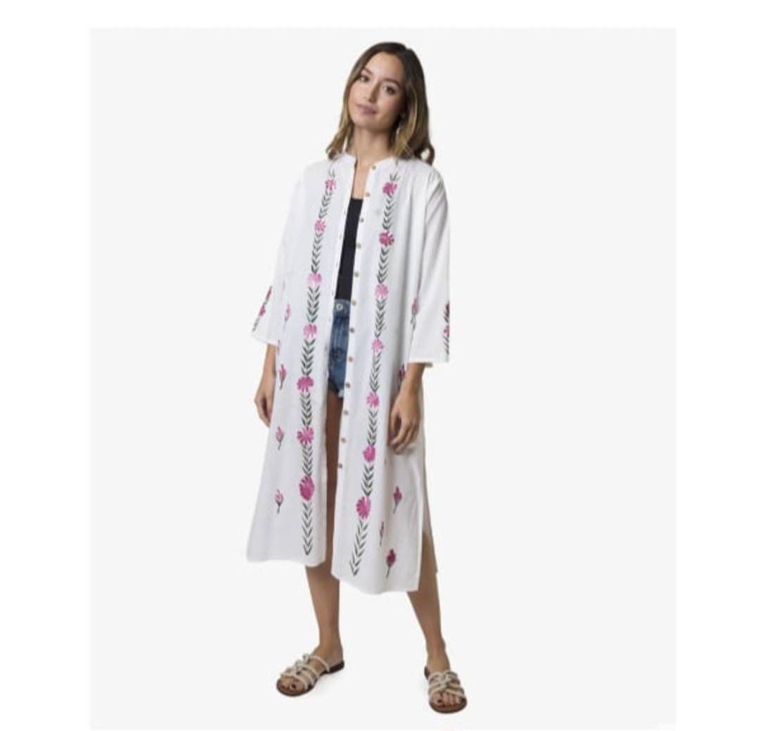 Tirante zuriz jantzita, gasa estanpatuarekin.