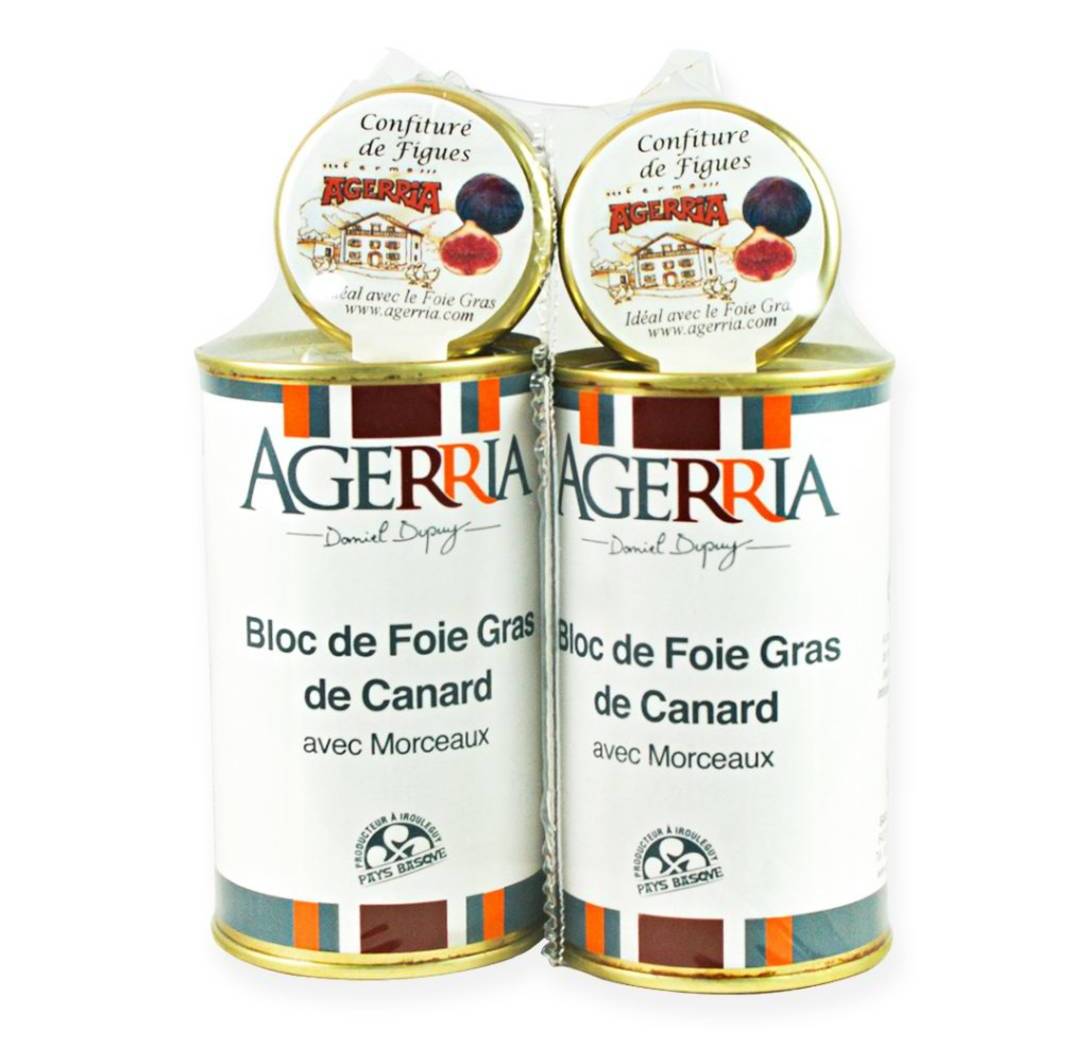 El bloc de foie-gras,es una preparación de hígado 100% en parte triturado, con un mínimo del 35% de trozos enteros.2 latas de 200 gramos y dos mermelada de higos.