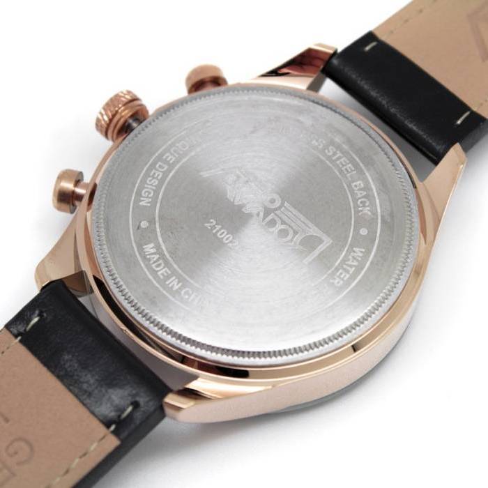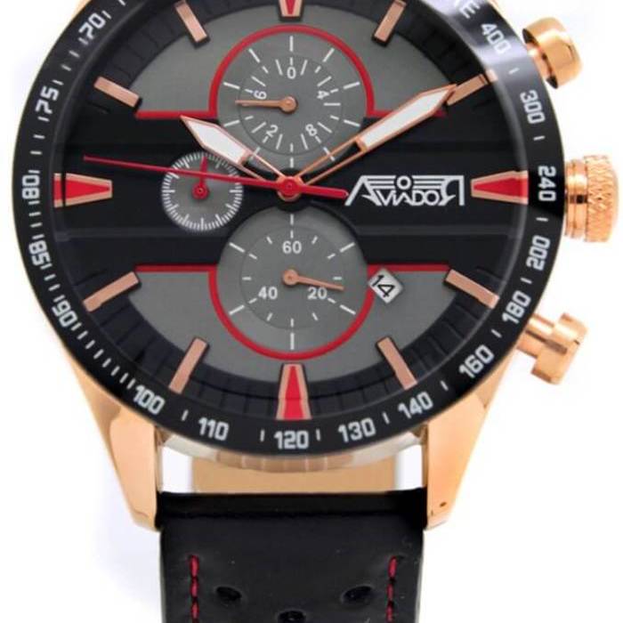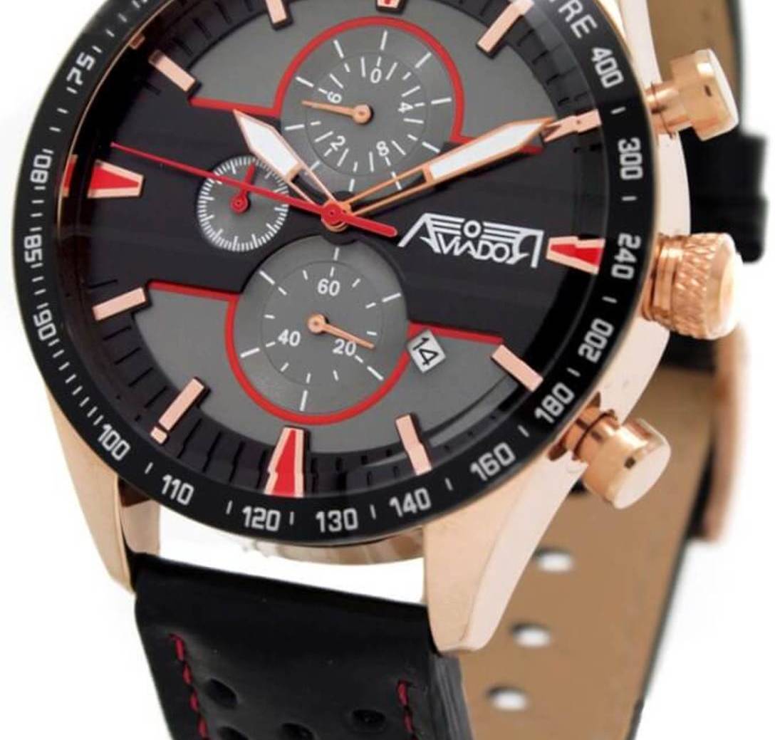 Erlojuaren ezaugarriak AV-21003G-C: Kaxa: Urre KOLOREKO METAL BIRZIKLATUEN ALEAZIOA IPRG· Tamaina: 46mm · Beira: Beira mineral gogortua · Iragazgaiztasuna: 3 ATM · Mugimendua: kuartzozko kronografoa datarekin · Uhala: berezko larru beltza, 22 mm-ko zabalerakoa.