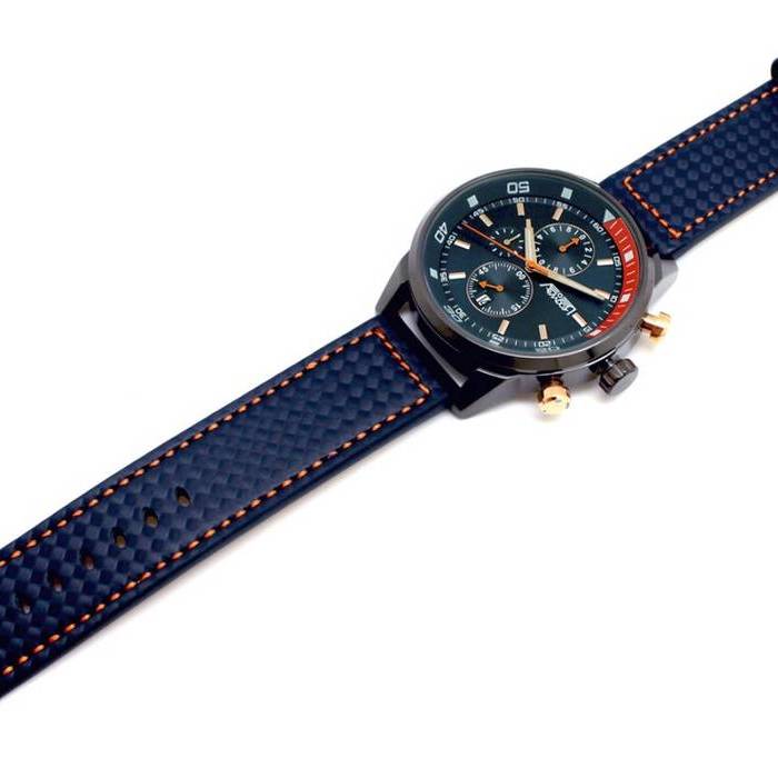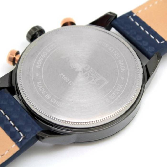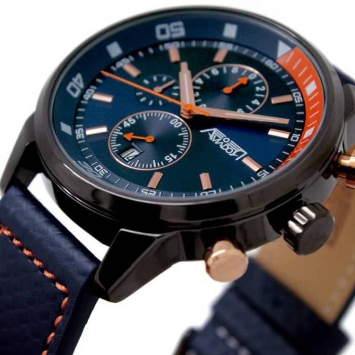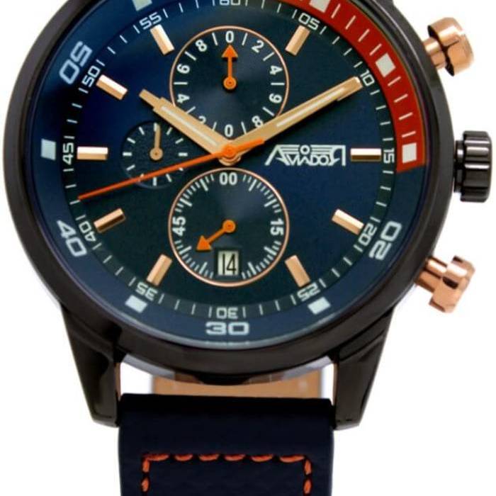 Erlojuaren ezaugarriak AV-210017G-A: Kaxa: KOLORE BELTZEKO METAL BIRZIKLATUEN ALEAZIOA URRE-KOLOREKO SAKAGAILUEKIN · Tamaina: Ø46 MM · Beira: BEIRA MINERAL GOGORTUA · IragazGAIZTASUNA: 3 ATM · Mugimendua: kuartzozko kronografoa SEIKO datarekin · Uhala: 22 mm-ko larru urdina.