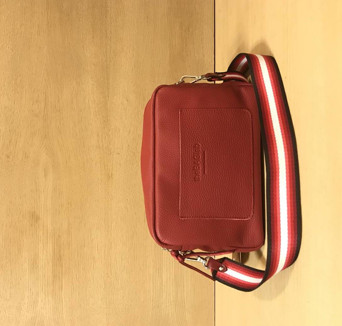 Behi-larruzko poltsa bandoleroa, aurrez aurreko poltsikoarekin eta kolore gorrikoa. Kremailera-itxitura, barruko poltsikoa eta bi mosketoi dituen koloretako bandolera duena.