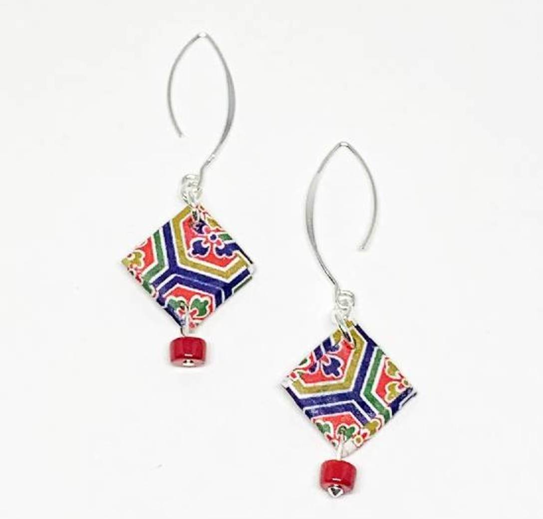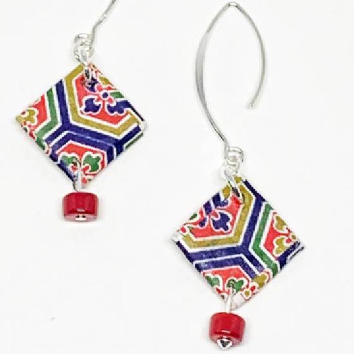 Kolore anitzeko diseinu geometrikoko belarritakoak, zilar-oinarriaren gainean muntatuak, harri naturalak.