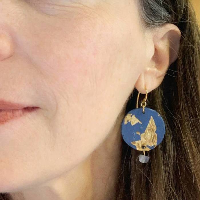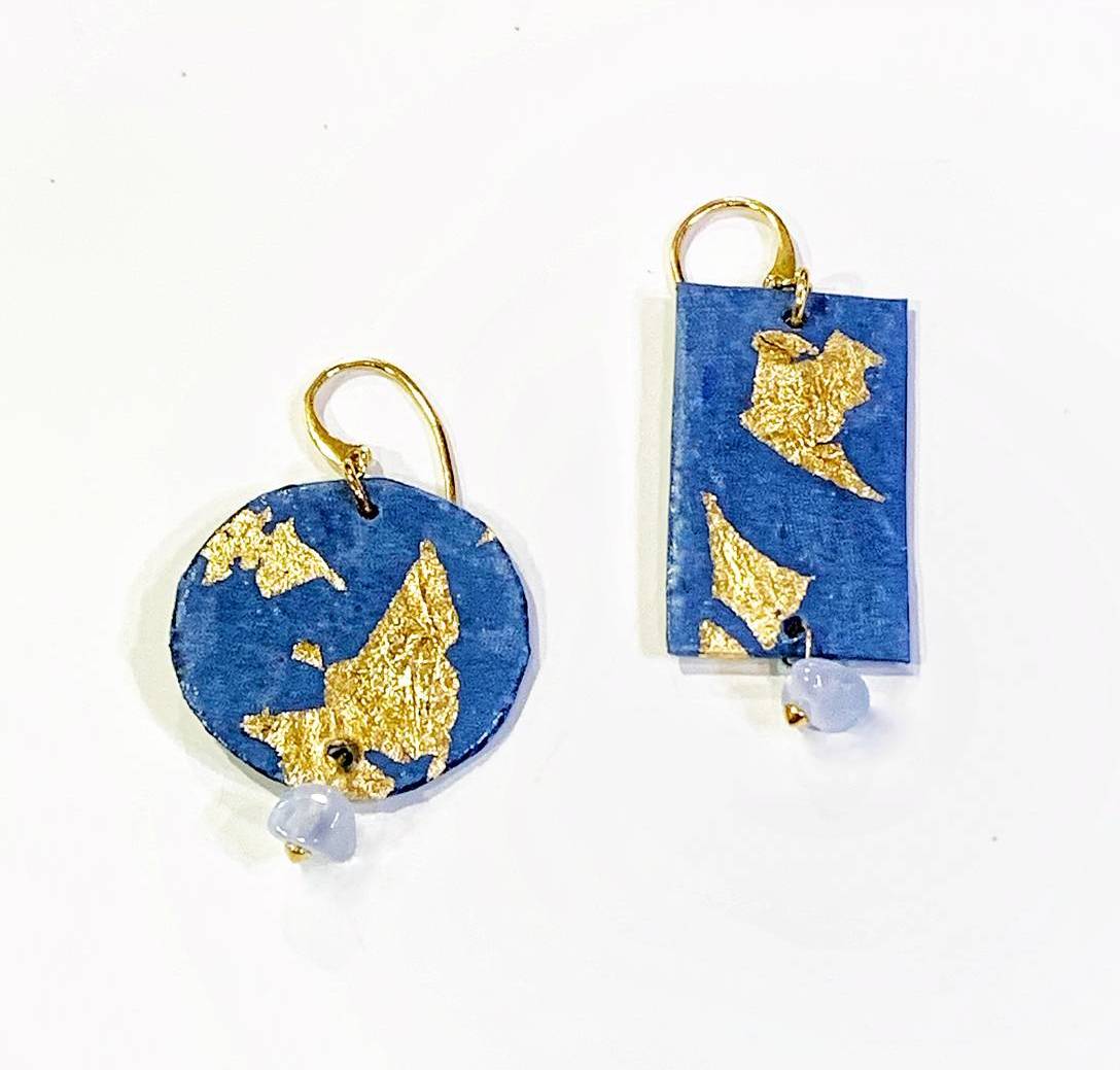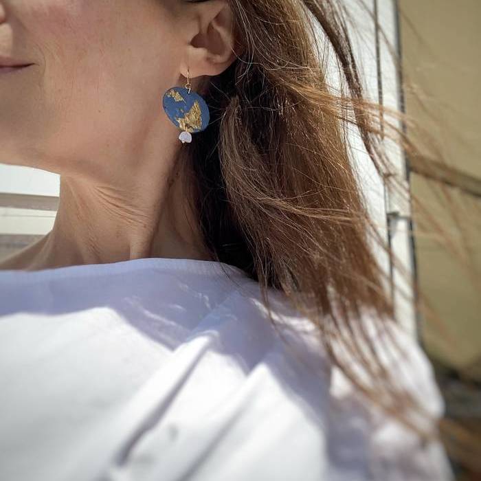Eskuz egindako belarritakoak, urdin koloreko material jasangarri eta zelulosarekin, urrezko ogiarekin, urre koloreko zilar bustiarekin eta harri kaltzedoniarrekin apainduta.
